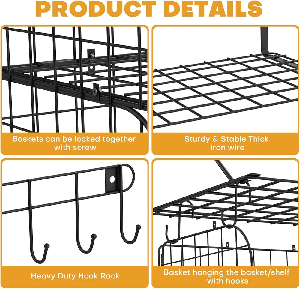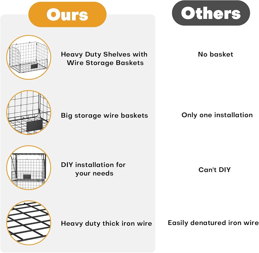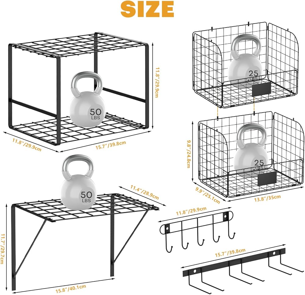 DIY Installation: Our 2024 upgraded heavy duty garage shelves fixtures are designed for easy DIY installation. Configure the shelves, baskets, and racks to meet your specific space needs. Whether you choose to interlock the baskets or hang them separately, this set offers maximum flexibility for your garage, workshop, yard, or garden storage needs.
