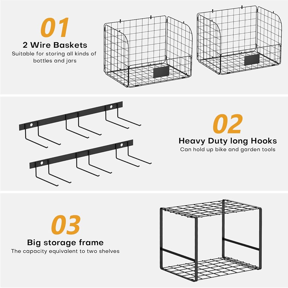 Garage Shelves Wall Mount with Wire baskets, 8-IN-1 Heavy Duty Garage Wall Shelving with Garden Tool Rack 2pack & 6pcs Hooks, Wire Shelf Baskets Tool Shelves for Home Garden Storage
