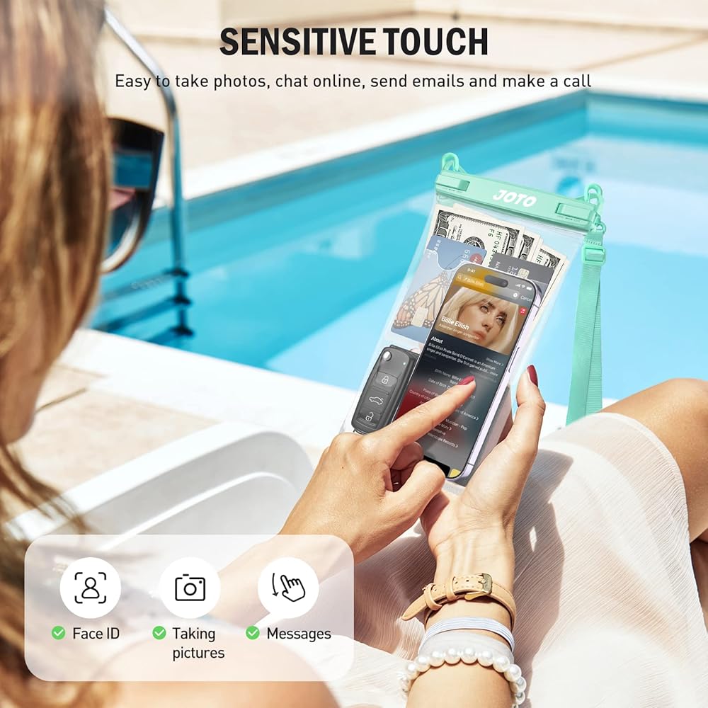 ✅ IPX8 Certified waterproof Pouch- After around 1000 tests, no leakage or water damage during 100 Ft/30 M deep underwater. Perfect for pools, beach, fishing, swimming, sailing, skiing, boating, kayaking, snorkeling, tubing, rafting, showering, sauna, and other water park activities, keep your phone and vacation essentials perfectly dry and safe