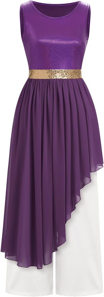 Praise Dance Dress for Women: 1PC Praise Dance Dress + 1 Pair of Pants. Women's metallic liturgical praise dance dresses sequin asymmetric lyrical dancewear, sleeveless irregular ruffle chiffon overlays dresses with loose tunic wide leg pants, shiny god bi color block praise loose fit dance dress, worship overlays and lyrical dance dress. Metallic tunic top dress with asymmetrical skirt and pants, suitable for praise dance, lyrical dance, Easter Christmas stage performance party