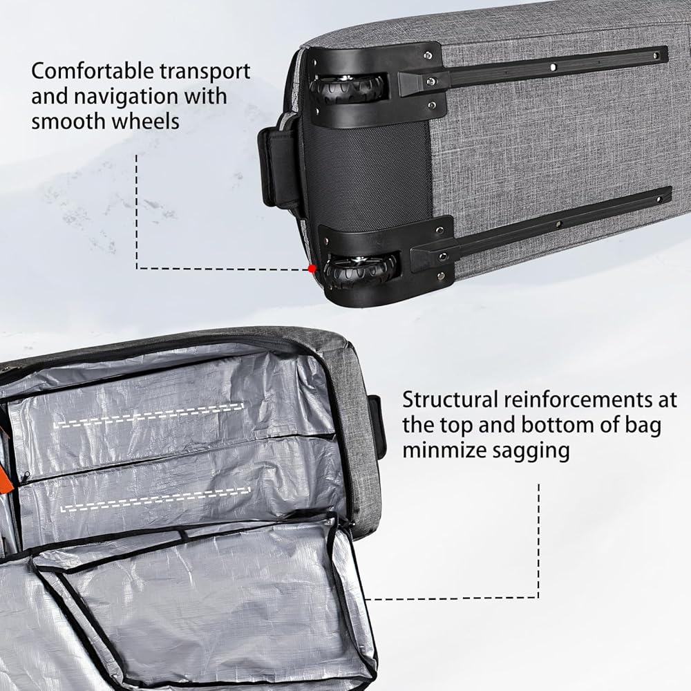 DURABLE AND WATERPROOF SKI BAGS:The snowboard bag with wheels is made of 600D Oxford cloth, which has excellent waterproof and durability. Reinforced stitching and thickened handle design, even if the bag is filled with heavy skiing equipment, there is no need to worry about the fabric breaking due to excessive weight.The lining is made of thermal, waterproof material to keep your skis safe during transit