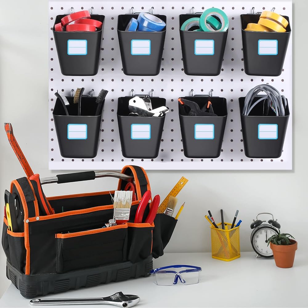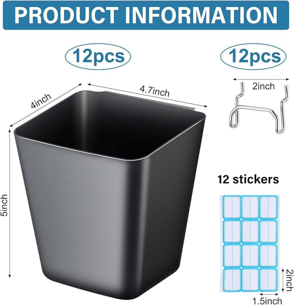 Namalu 12 Pack Peg Board Storage Bins with Labels and Hooks Square Box Shape Pegboard Cup Holder Accessories Pegboard Organizer for Craft Room Wall holder Workbench(4.7 x 4 x 5 Inch, Black)