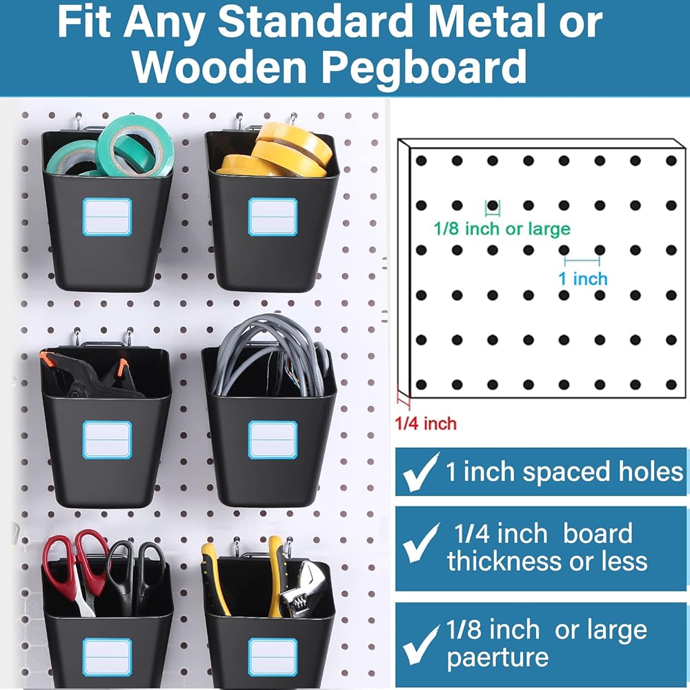 • Applicable Peg Board Size: these garage storage hooks can be easily DIY installed through metal hook accessories, which are suitable for most standard size peg boards with the hole diameter of 1/8-1/4 inch, the hole spacing of 1 inch and the thickness of 1/4 inch, and suitable for metal, plastic or wooden peg boards