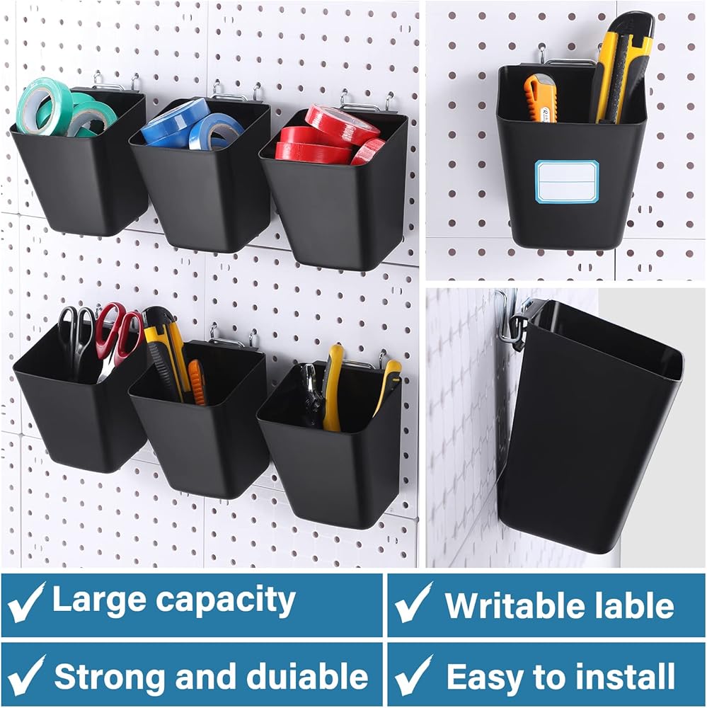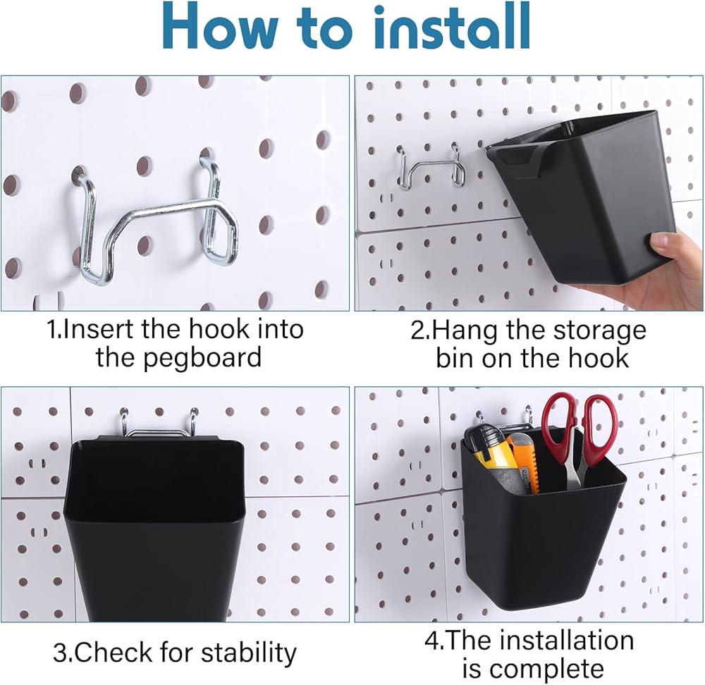 • Quality Materials: these peg board organizer accessories are made of quality polypropylene, with smooth surface, sturdy and long lasting, and can hold up to 25 pounds; They can be stably fixed on the peg board with a metal hook, which are easy to install and use; Just insert the hook into the peg board, and then hang the storage bin on the hook; The wall mounted peg board bins can save you more space, and the tools can be neatly placed on the peg board within reach