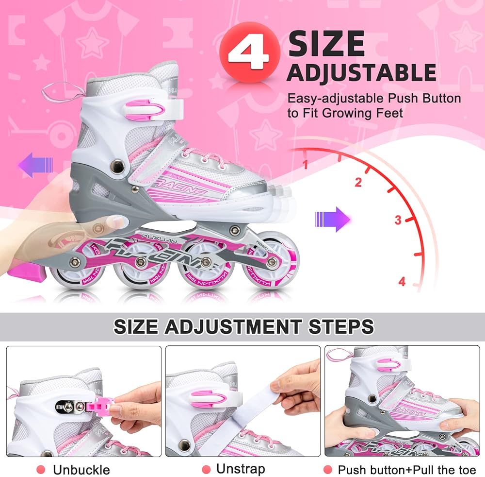 ★ ONE PAIR FOR FOUR SIZES - Easy and convenient 1 push button to adjust different sizes ensures years of fun. No need to worry about your kid's growing foot anymore. Check our size chart in the product image, make sure you chose the right pair!