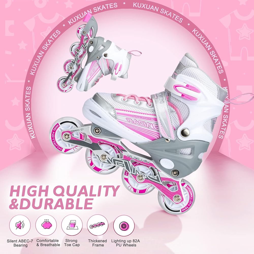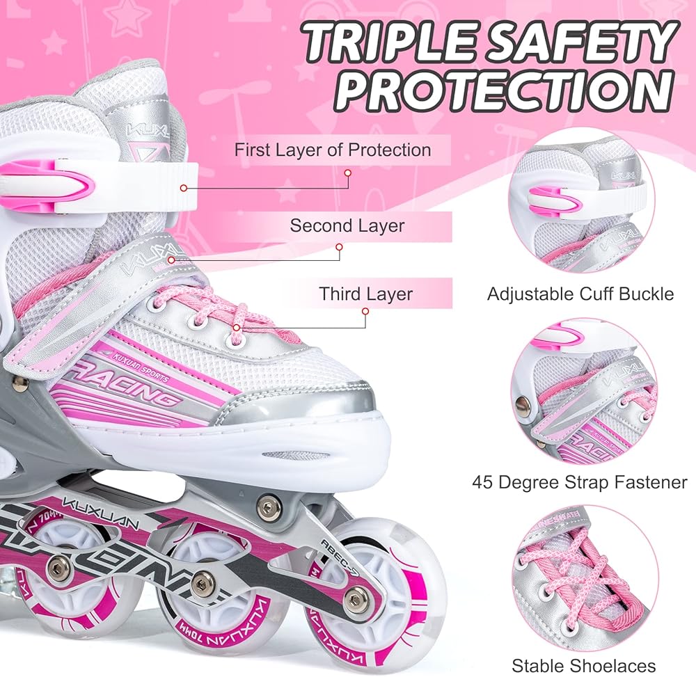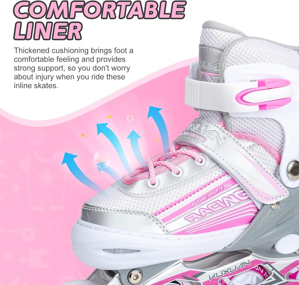 ★ COMFORTABLE & DURABLE - The main body of the kids skates are comprised of premium PP material,aluminum frame provides ankle support and the inner boot is breathable,durable 82A polyurethane(PU) wheels with ABEC-7 bearings provide smooth,quiet and confident ride.It can be used both outdoor and indoor.