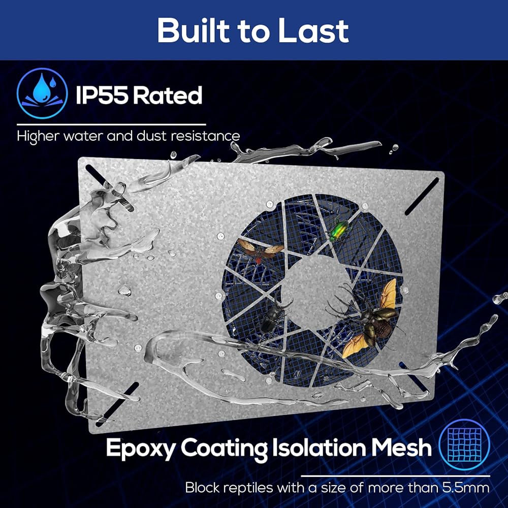 🍃【Built-in Isolation Mesh & IP-55 Rated】5.5mm Isolation Mesh prevents reptiles from gaining access to the crawl space; Solid-Built Aluminum Zinc Shell with IP-55 rating, highly resistant to liquids and dust, higher weather-proof, makes it ideal for work in a humid environment with a long service life, don't worry it rust. Maintenance free crawlspace fan helps increase air circulation to protect damp areas from condensation and wood rot.