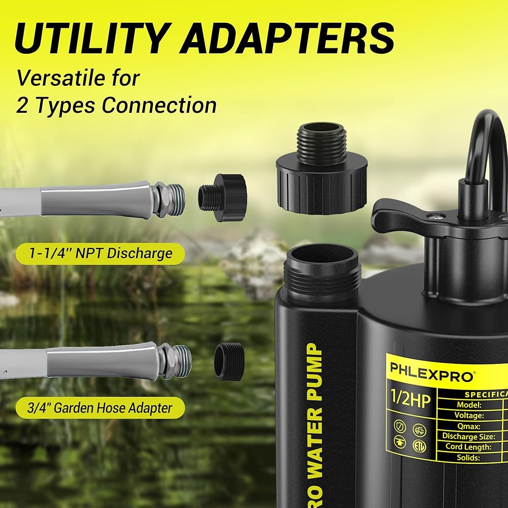 IPX8 WATERPROOF PUMP: This drain pump features a 1-1/4" NPT discharge and a 3/4" hose adapter for flexible hose sizing. Its submersible design includes a removable screen to prevent damage and filter debris, pumping water down to 1/8" from the surface.