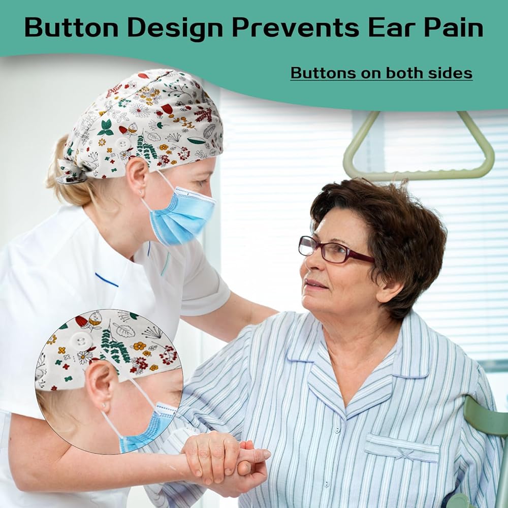 【BUTTON DESIGN】: Surgical caps for women comes with buttons on both sides, which is convenient to match with the mask or goggles, preventing ear ache caused by wearing the mask for a long time.