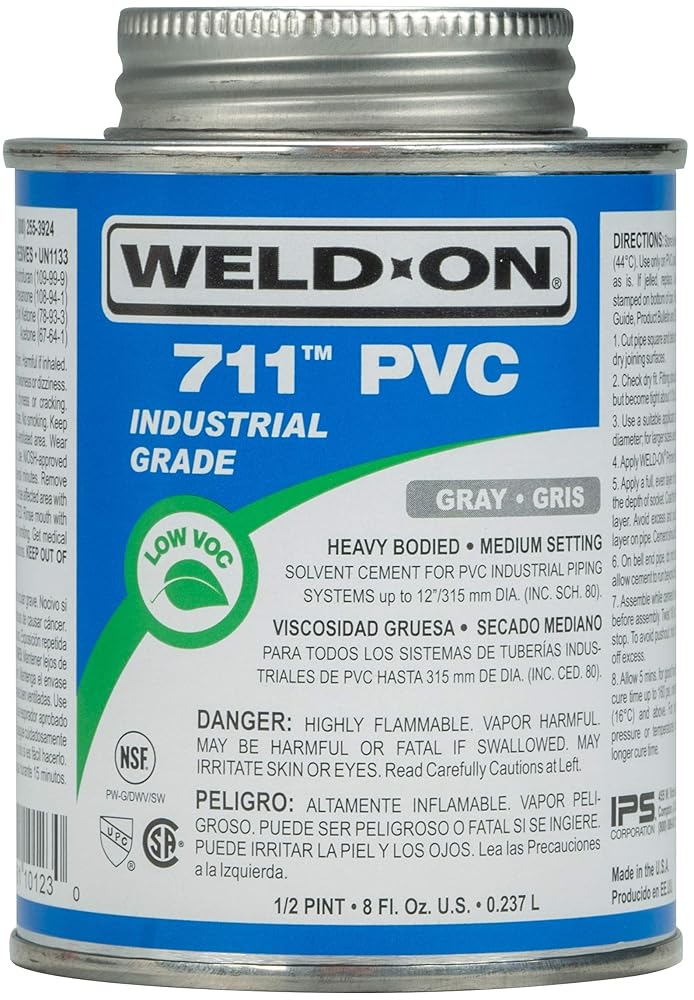 Weld-On 711 Industrial Grade PVC Solvent Cement offers the bonding strength and great gap-filling properties needed to tackle a wide variety of industrial piping applications. Offering exceptional versatility, this high-strength, industrial-grade PVC solvent cement is suitable for use with all rigid PVC pipes and fittings with an interference fit up to a 12-inch diameter. It is an ideal choice for potable water pressure systems, irrigation, turf, conduit, sewer, and drain, waste and vent (DWV) systems. And thanks to its heavy-bodied viscosity and medium relative set time, this PVC solvent cement applies smoothly and excels in warm weather and other applications that may demand a longer working time. A preferred choice of contractors worldwide, Weld-On solvent cements are recognized globally for their industry-leading strength and ease-of-use. Commonly referred to as PVC glue, PVC solvent cement fuses pipes and fittings at the molecular level for a durable and long-lasting joint. Choose from a wide selection of Weld-On solvent cements to find the product that is perfect for your application.