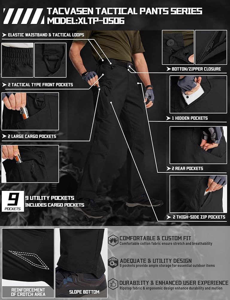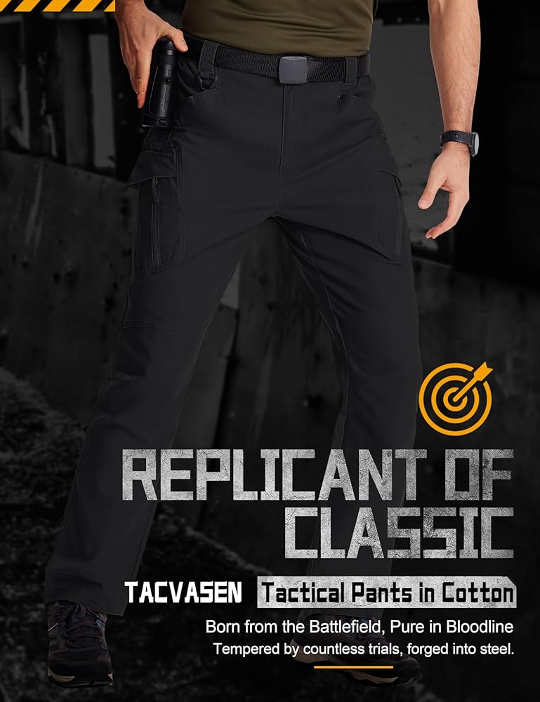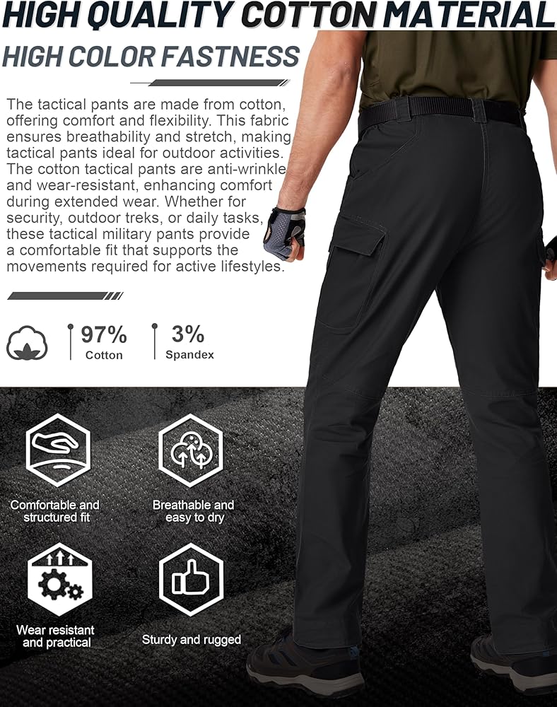 Comfortable & Custom Fit: The tactical pants are made from cotton, offering comfort and flexibility. This fabric ensures breathability and stretch, making tactical pants ideal for outdoor activities. The cotton tactical pants are anti-wrinkle and wear-resistant, enhancing comfort during extended wear. Whether for security, outdoor treks, or daily tasks, these tactical military pants provide a comfortable fit that supports the movements required for active lifestyles.