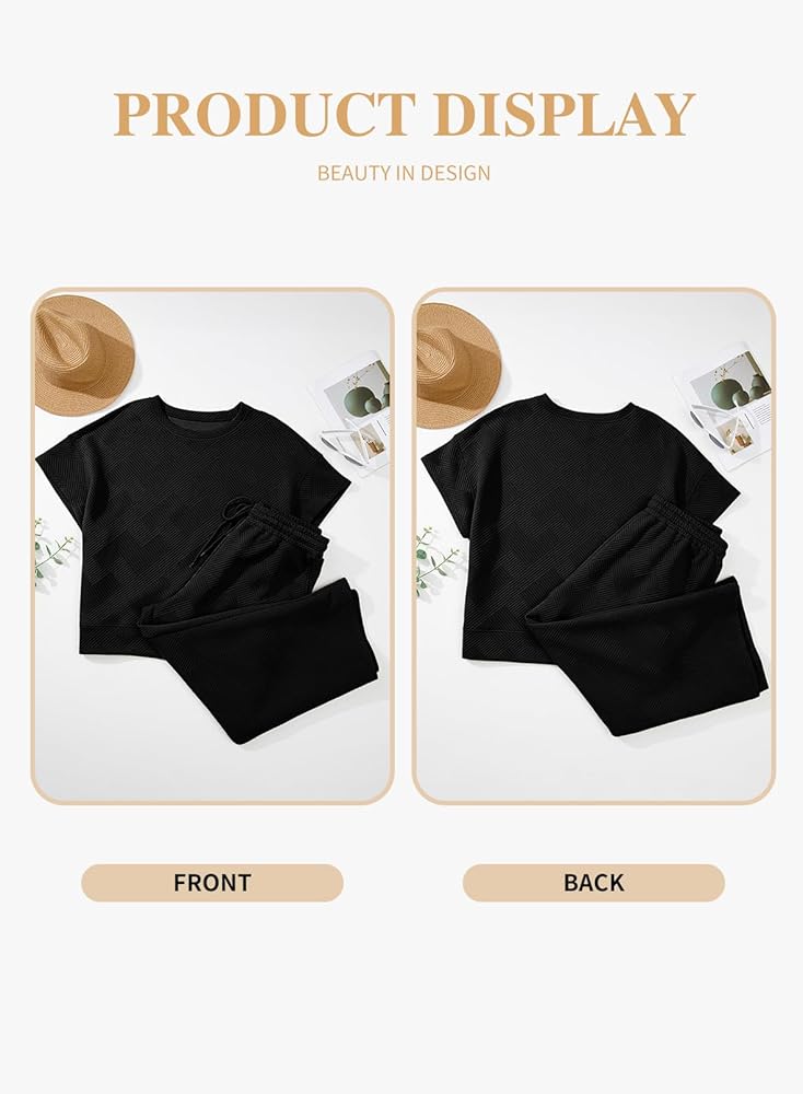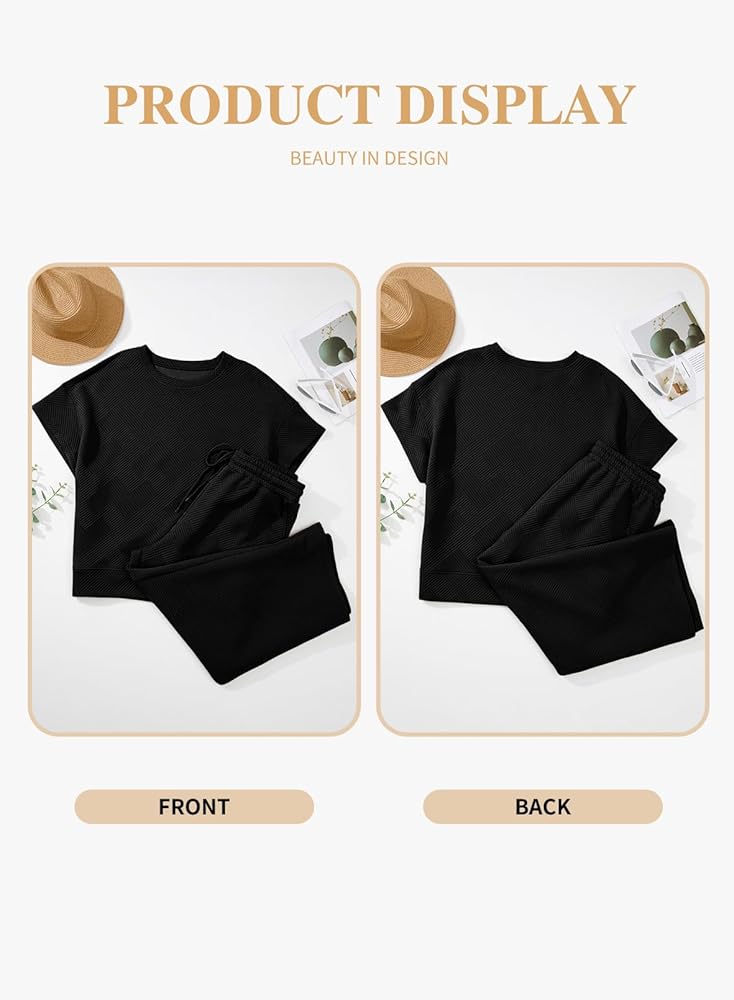 Feature: Plus size tops with crewneck; short sleeve; solid pattern; high waist long pants; wide leg style with adjustable drawstring;two side pockets; casual loose fit lounge sets