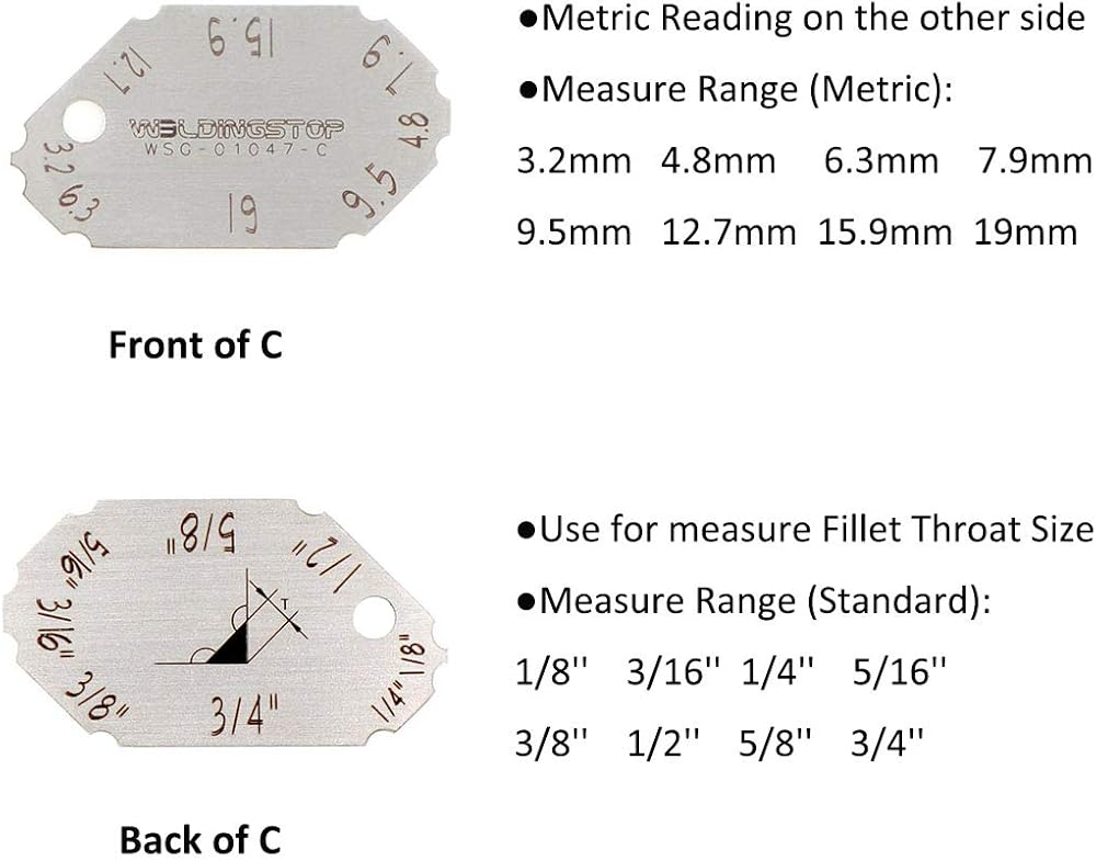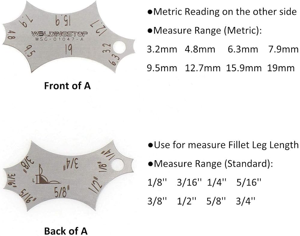 Measures Fillet Throat Size and Leg Length Size in Metric---- 3.18mm 4.76mm 6.35mm 7.9mm 9.52mm 12.7mm 15.87mm 19.05mm