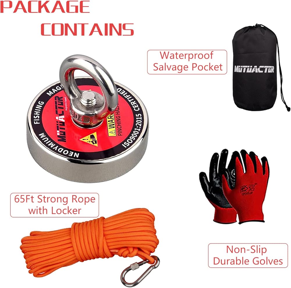 [Magnets Package List] Fascinated by the blue box at first view, open the box, and you can see anti-slip gloves, a magnet with thread locker, durable 65Ft salvage rope, and waterproof bags. Taking your children, enjoy the fun of heavy-duty magnet fishing