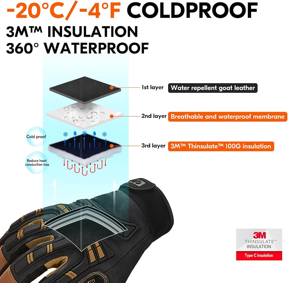 3M Thinsulate insulation C100 better protects hands from the cold condition; Breathable waterproof membrane to keep your hands dry from wet condition
