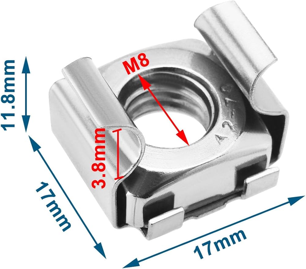 -Overall size: 17 x 17 x 11.8mm, thread size is M8 *1.25mm, each M8 cage nut weighs only 8g, small size and light weight.