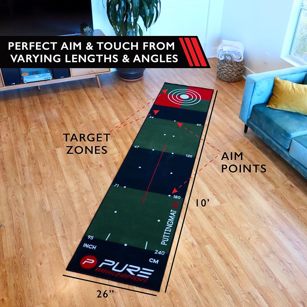 VERSATILE SIZE FOR HOME AND OFFICE. At 10 foot length by 26 inch width, the 3.0 putting mat offers over 21 square feet of putting area and the opportunity to practice those crucial putts 10 foot and under putts