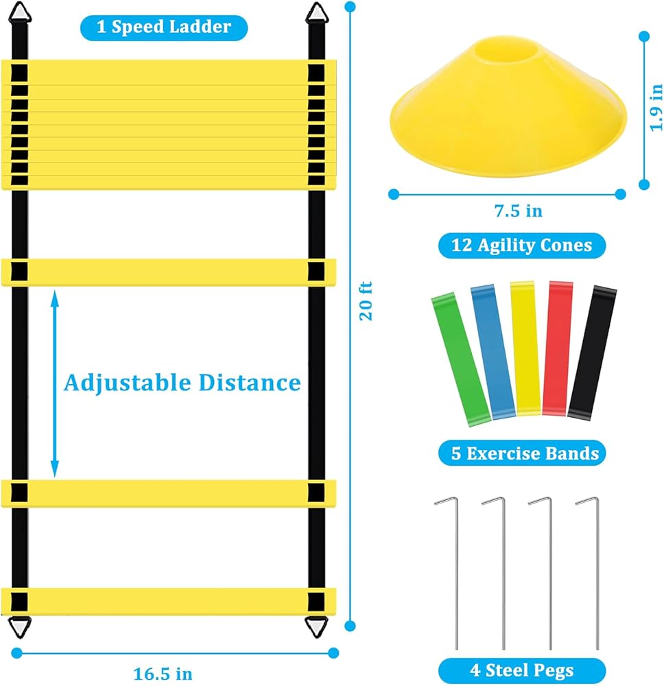 Versatile Training Set: Includes 20-foot agility ladder, 12 yellow cones, 4 stakes, and 5 resistance bands for comprehensive speed and agility drills.