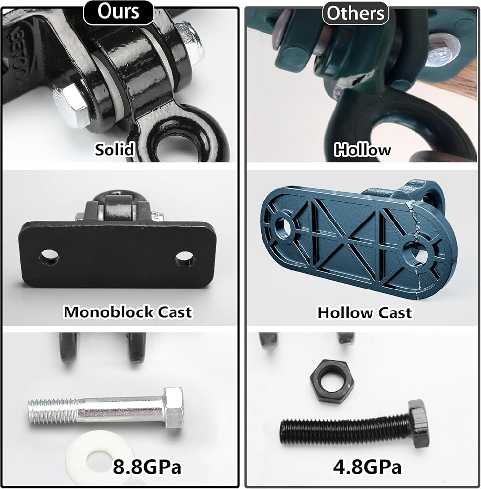 High Quality: One-piece Iron Casting is heavy duty and superior quality, maximum load of 2400 Lbs. Perfect choice for all kinds of swing set products indoors & outdoors, including gymnastics rings ceiling mounts, porch swings and yoga swings