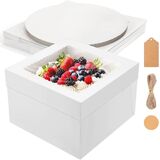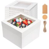 Complete Decorative Accessories:We present to you an exquisite dessert box with the following features. 30 Pack 12x12x8 inches cake boxes ,It is suitable for placing cakes within 10 inches, and an 8-inch height can accommodate even taller cakes.comes with 30 stickers, 30 flower head labels, and 6 hemp ropes, making your cake box decoration more personalized and adding a festive atmosphere.