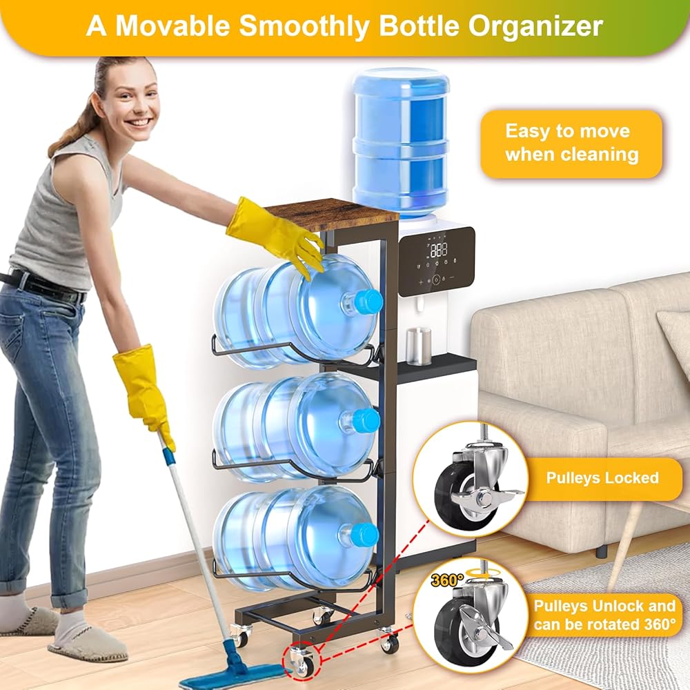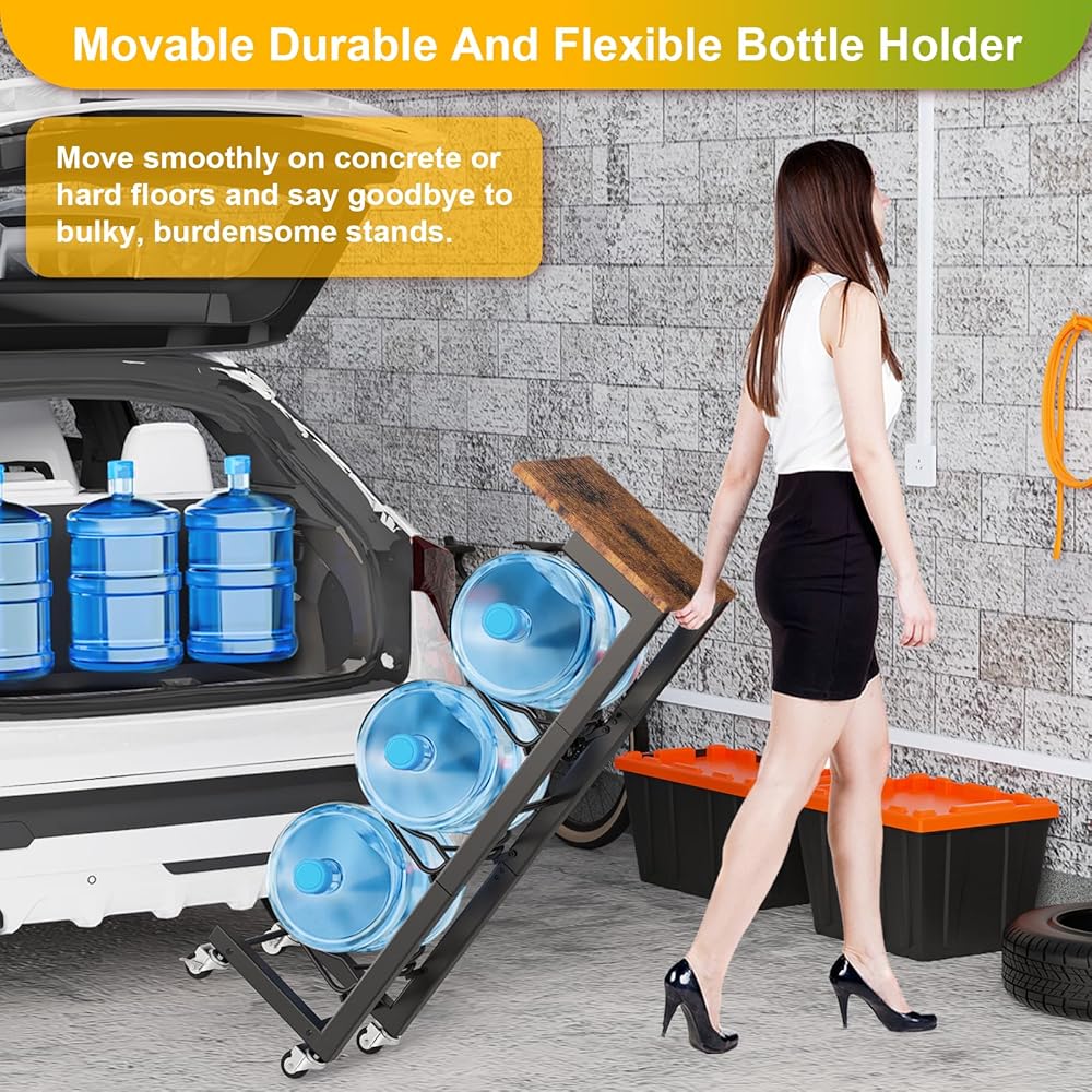 Movable Design:This water bottle rack is equipped with 4 wheels (2 lockable) to provide convenience and flexibility, When cleaning no longer struggling to move the 5 gallon water bottle to another place. You can also move smoothly on the concrete or hard floor.You can also lock the casters on the bottom to secure it near the cooler.
