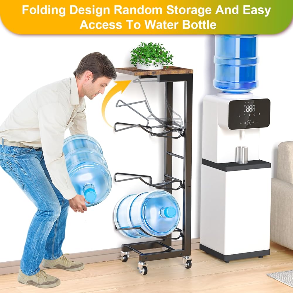 Loading and Unloading Easier:The 3 bottle slots can be folded upward and moved smoothly. You can grab the two sides of the 5-gallon bottles to access water directly without using auxiliary water-fetching tools and no need to fold it up the slots to access water.This 5 gallon Water Jug rack makes access to water easier and simpler.