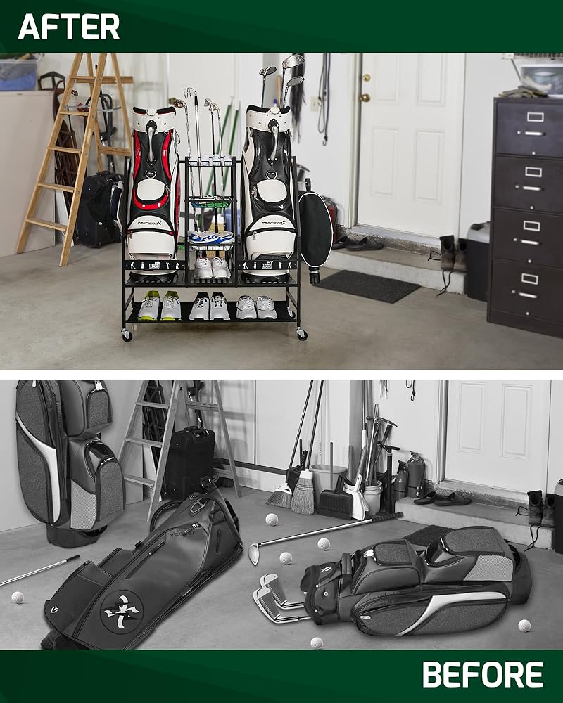 【Organized Golf Storage】: Keep your golf gear neatly arranged with our 4 Golf Bags Storage Rack. This storage solution is perfect for avid golfers, ensuring that your bags are easily accessible and your space remains clutter-free.