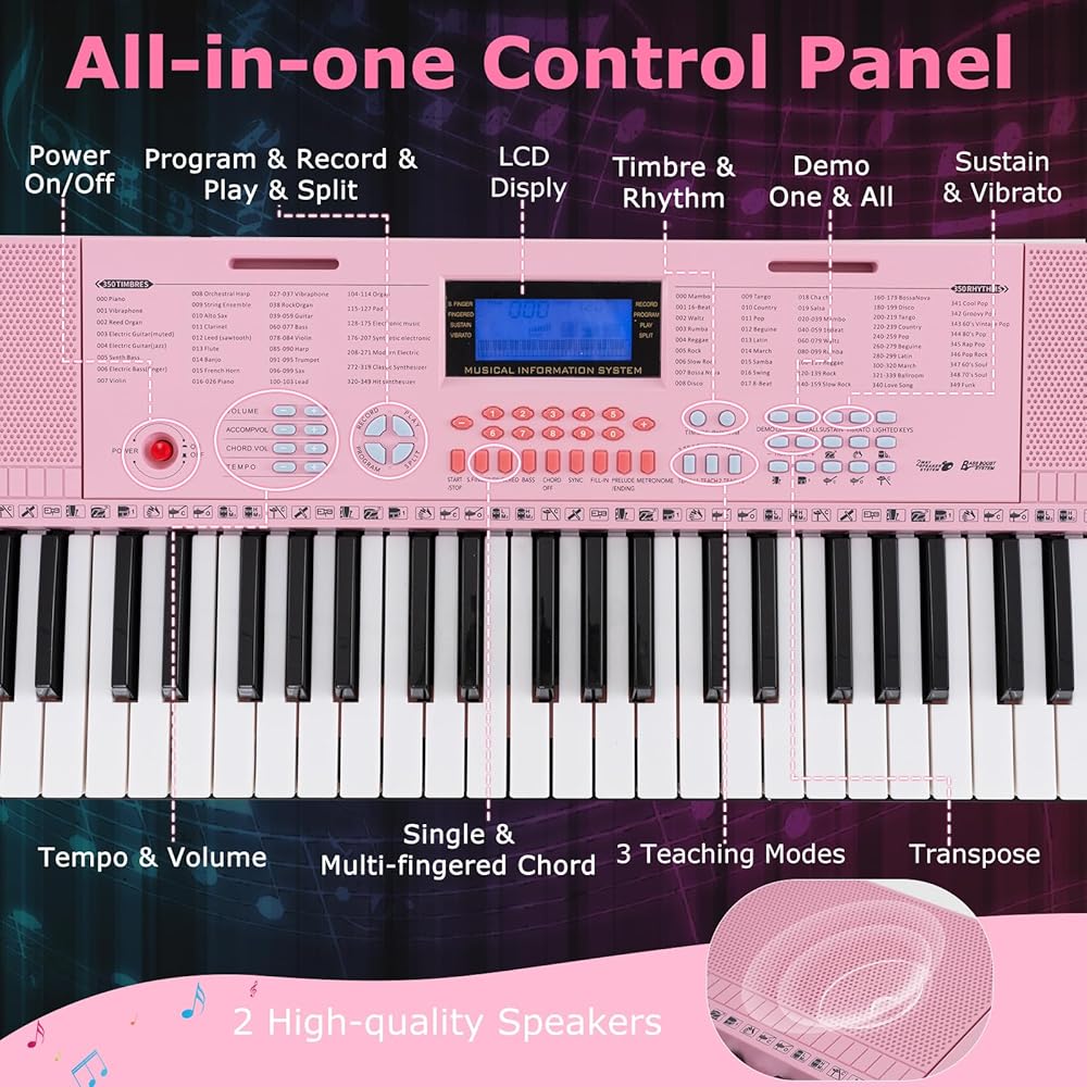 Abundant Music Functions: With 350 timbres, 350 rhythms, 50 demo songs, 61 keyboard percussions and 8 panel percussion music, this electronic keyboard offers a wide range of musical options. Plus, the all-in-one control panel also has program, record, play, split, single & multi-fingered chord, sustain, vibrato, transpose, demo one & all, tempo, volume and more functions.