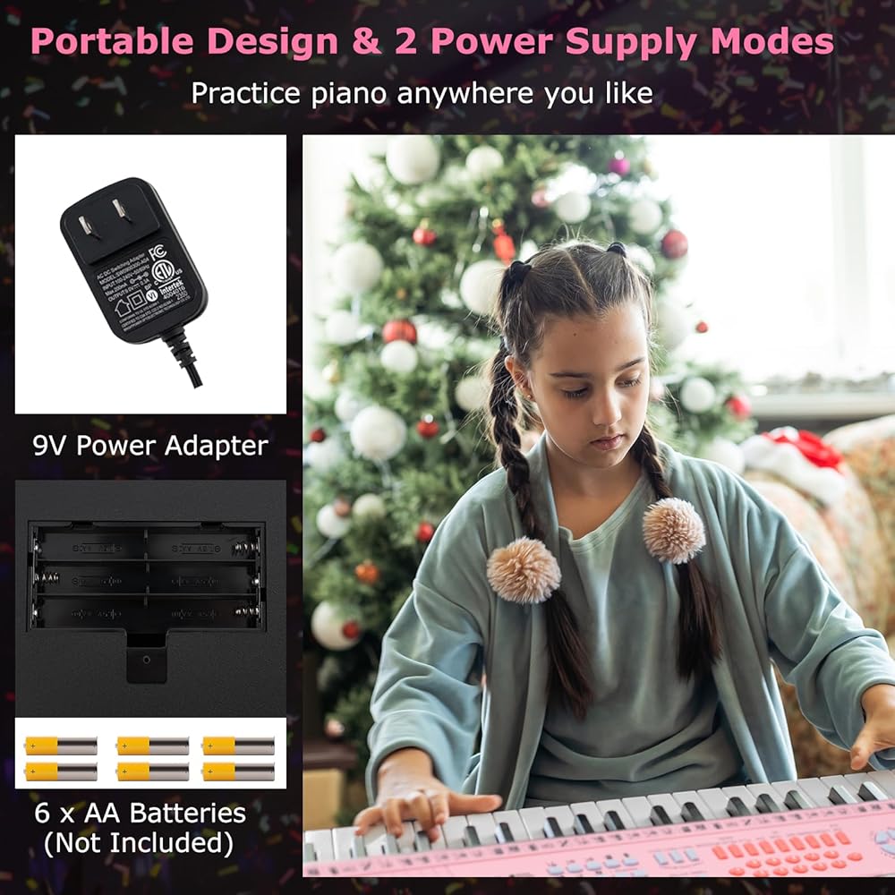 2 Power Supply Modes & Portable Design: This digital piano can be powered by the included 9V power adapter or 6 x AA batteries (not included). Designed for portability, this digital piano is lightweight and easy to transport, making it suitable for you to practice piano anywhere you like.