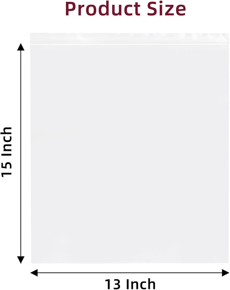 Large Storage Bags: Our 2 gallon storage bags measure 13" wide x 15" tall, come in a pack of 10, and are made of thick plastic material to keep food flavor and your items clean and secure with an easy-sealing zipper closure