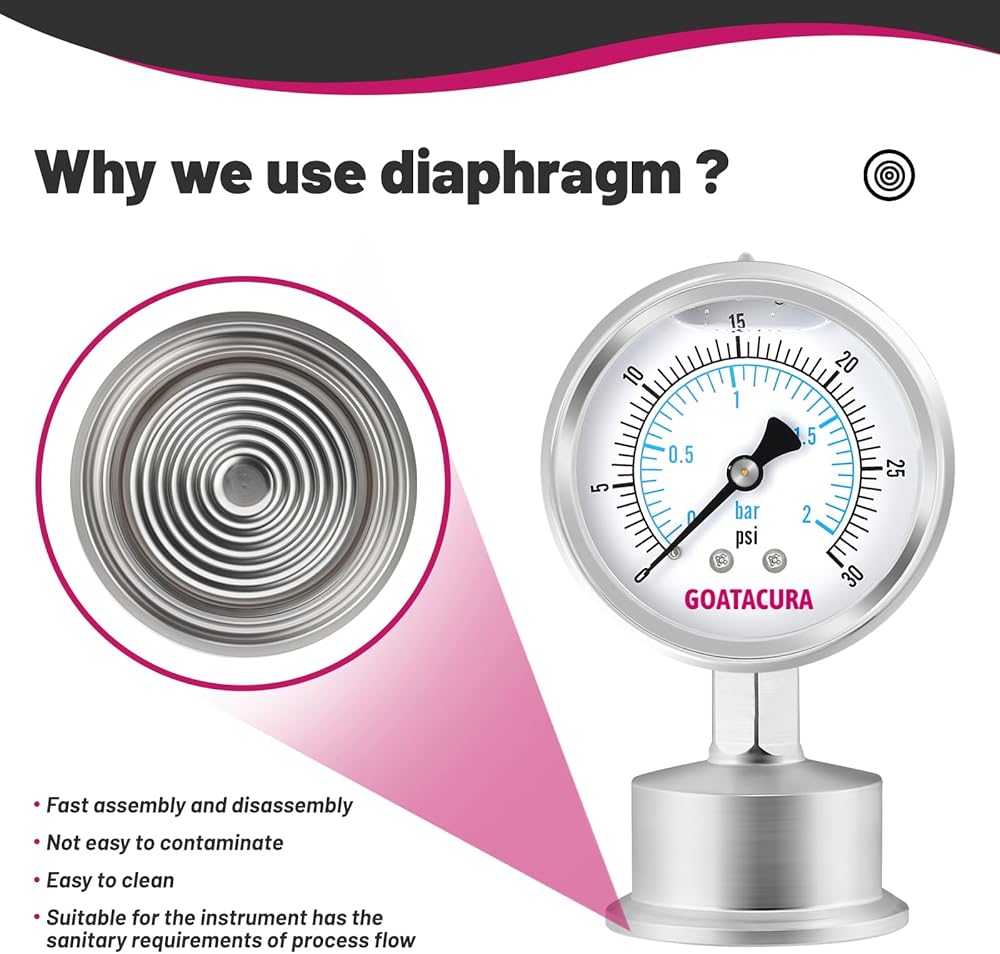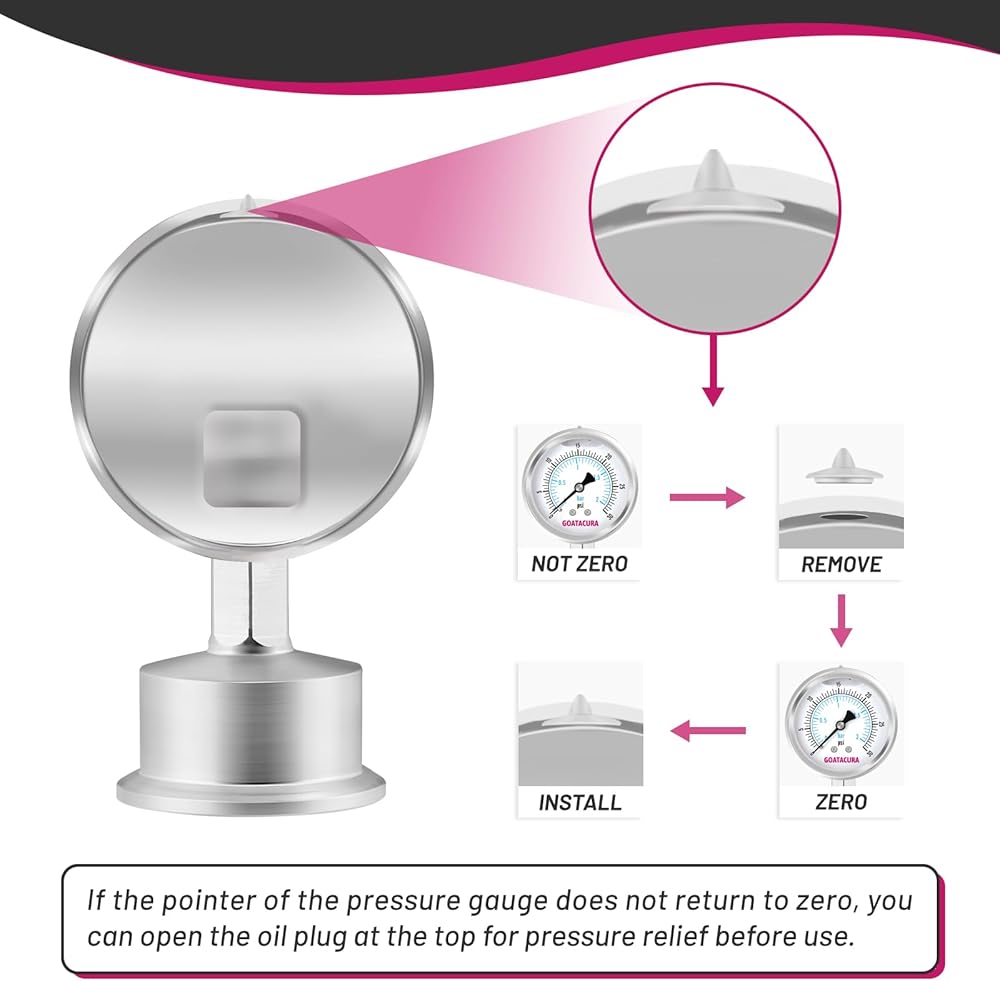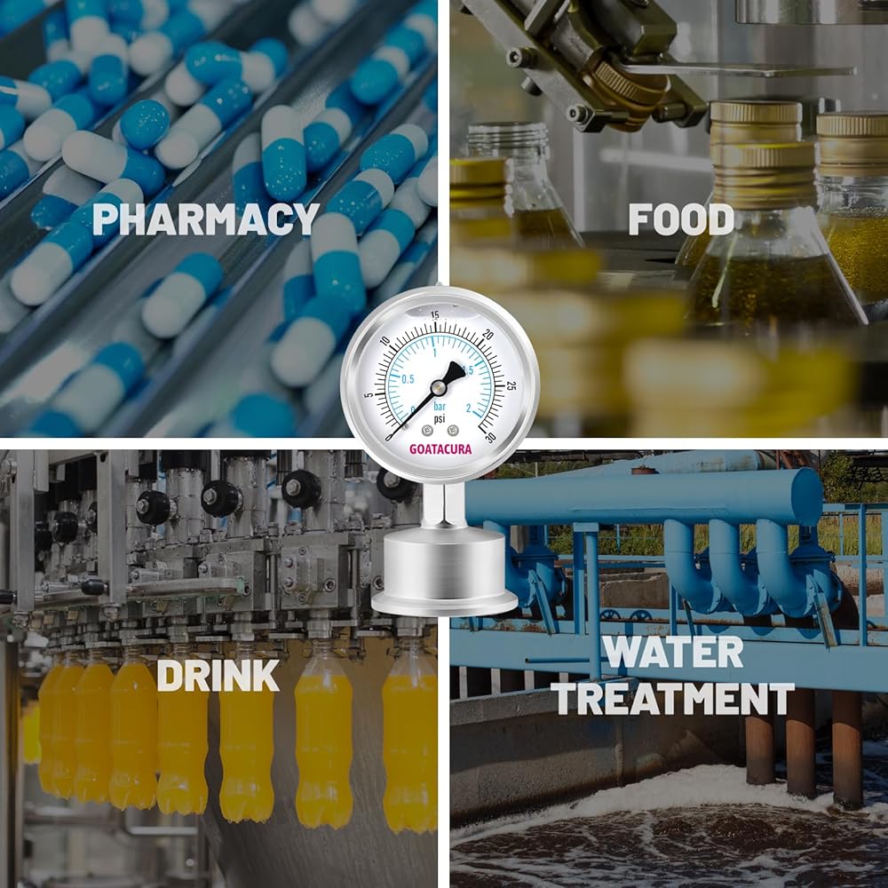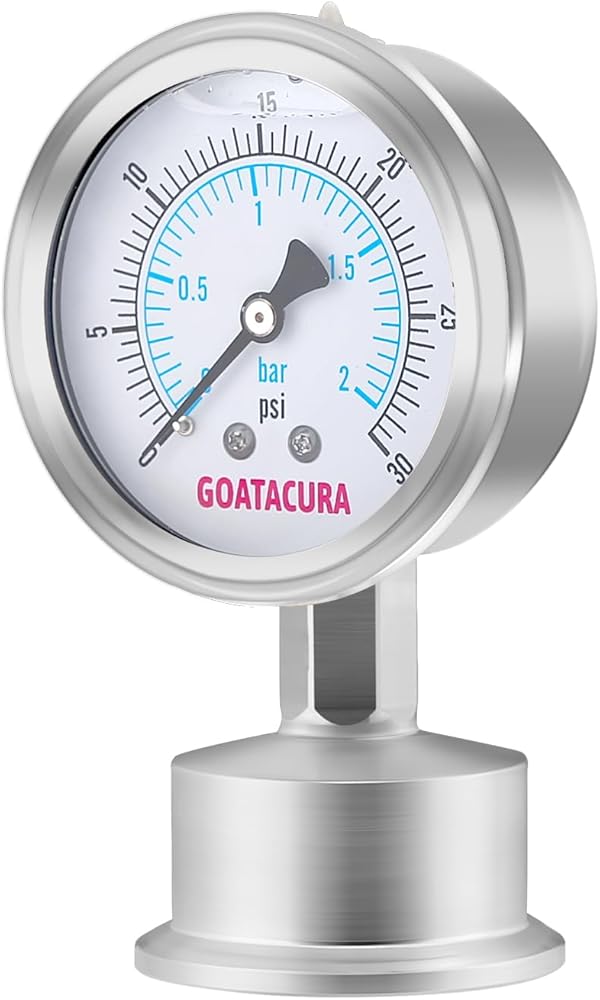GOATACURA liquid filled pressure gauge for measuring the pressure during technology needing sanitary standard like brewing beer,wine,wort. Dial Size: 2.5" Pressure Range: 0-60psi, dual scale, clear reading Accuracy: +/-2-1-2%, comply with ANSI B40.1 (Grade A) standard, with accuracy test report Connection Location: Lower mount Connection: 1.5" Tri Clamp Bottom Mount Case: 304 stainless steel case Filling: Glycerin filled, enhance vibration and shock resistance, extend product life Dial: Aluminum, white Pointer: Aluminum, black Window: Polycarbonate Ingress Protection: IP67, waterproof Working Temperature: -4 to 140 deg F/-20 to 60 deg C Ambient Temperature: 140 deg F/60 deg C maximum