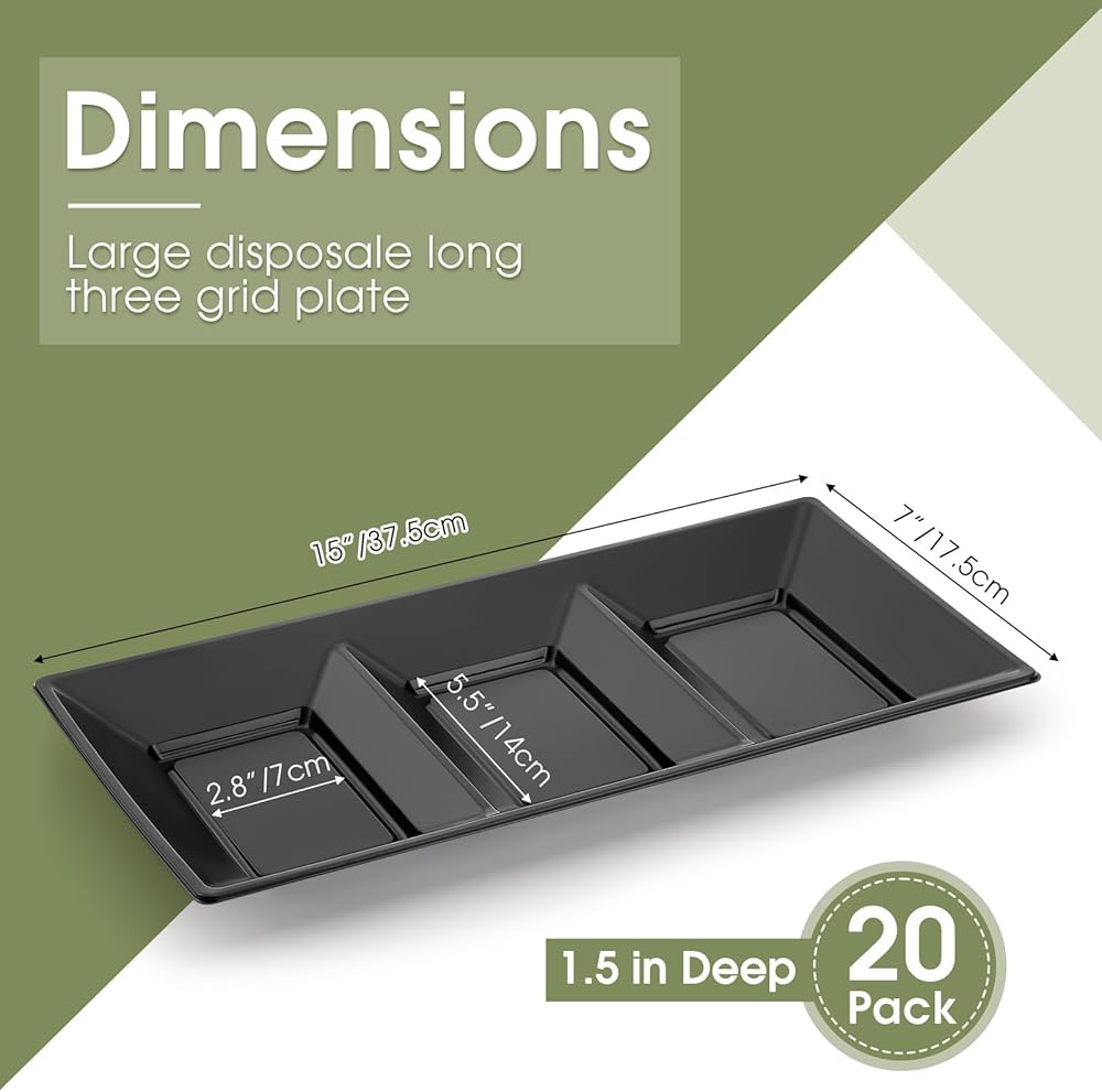 Versatile Serving Tray: ideal for a range of dishes and special occasions, this set includes 20 appetizer serving trays suitable for appetizers, desserts, fruits, and more; Each tray measures 15 x 7 inches/ 37.5 x 17.5 cm, divided into 3 sections, providing ample space for a variety of foods