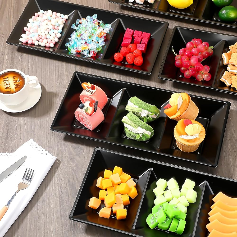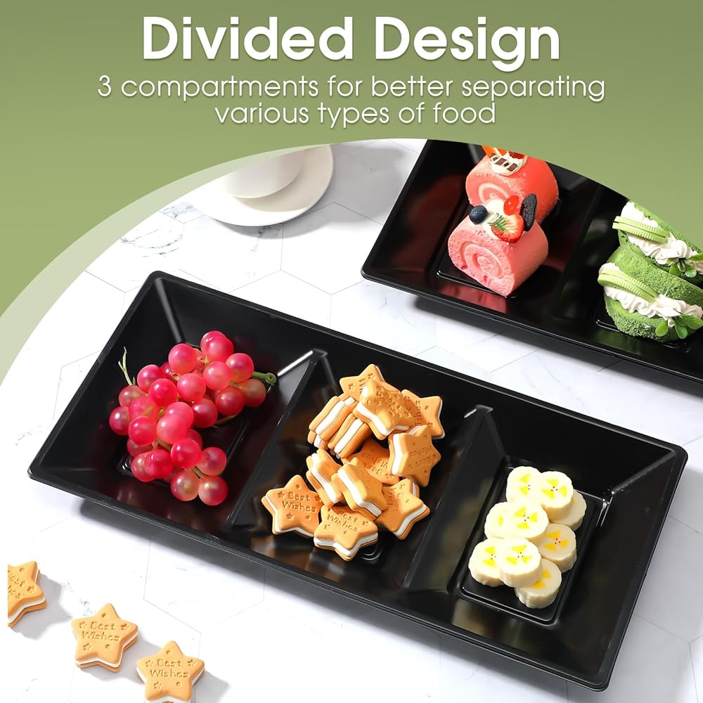 20pcs Black 3 Section Serving Tray Bulk Serving Dish Compartment Appetizer Tray Plastic Dessert Platter Divided Disposable Plate for a Tini Bit Older Party