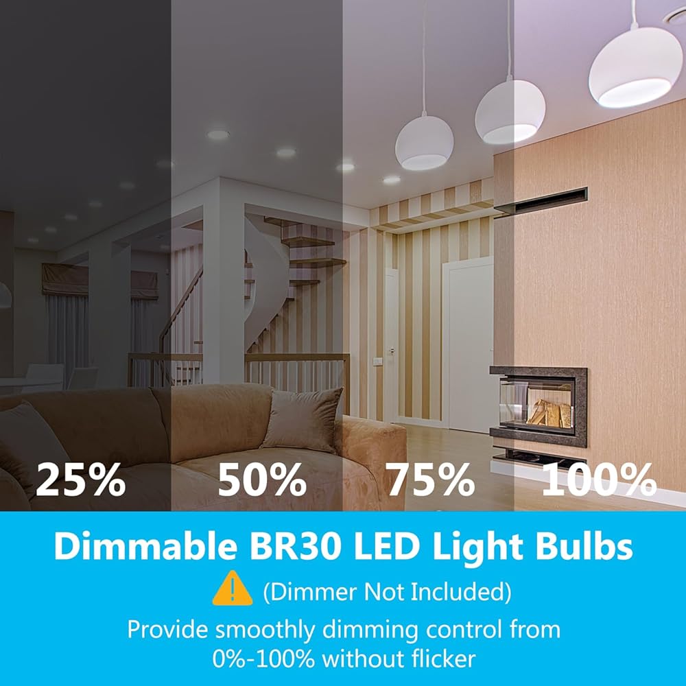 Dimmable LED Flood Light Bulbs Indoor:With excellent dimming capabilities,our BR30 LED flood lights is seamless dimming capabilitiesm,suitable for any mood or decor.Features a 120° beam angle for wall washes and recessed lighting to cast light over a large area. Warm Tips:Dimmer is not included