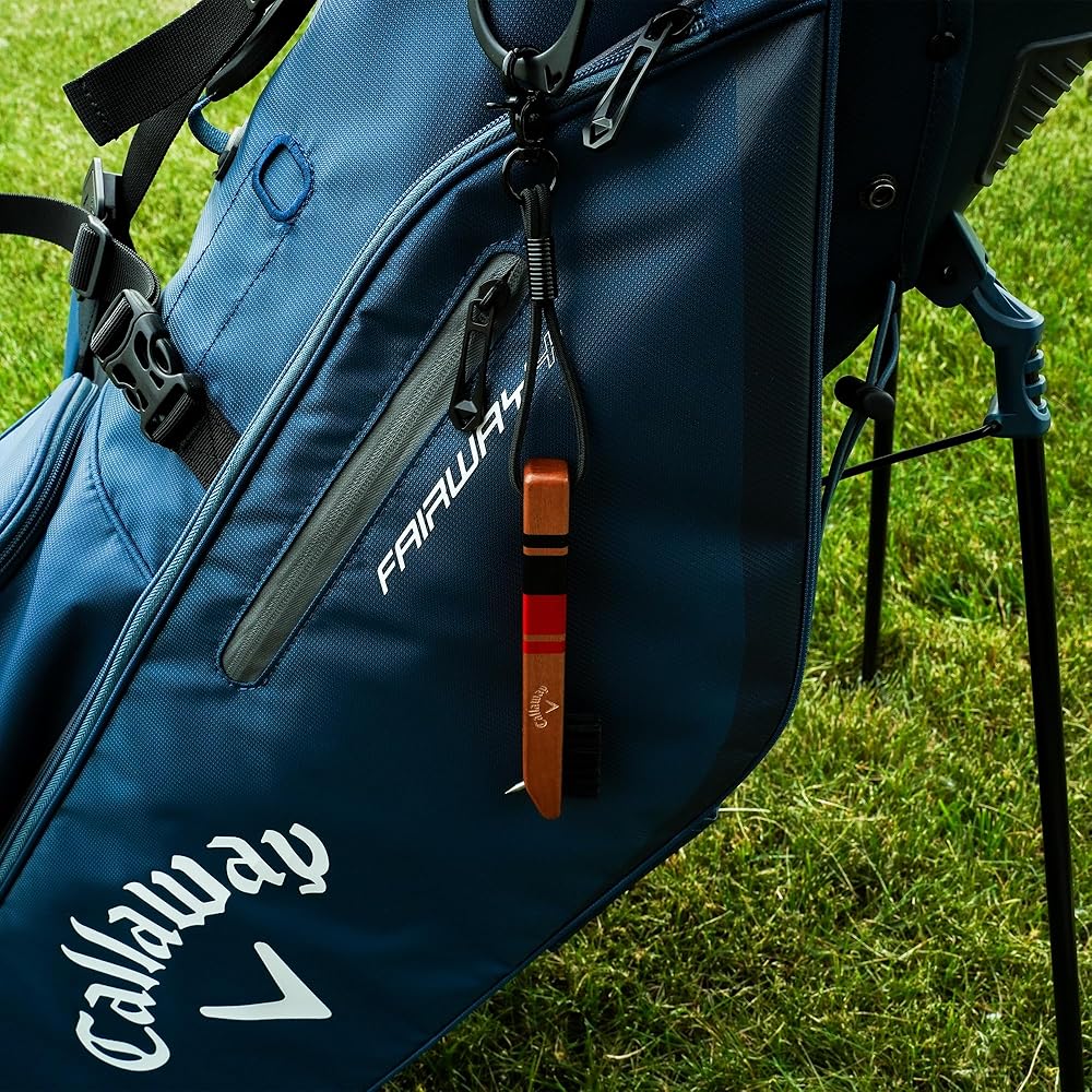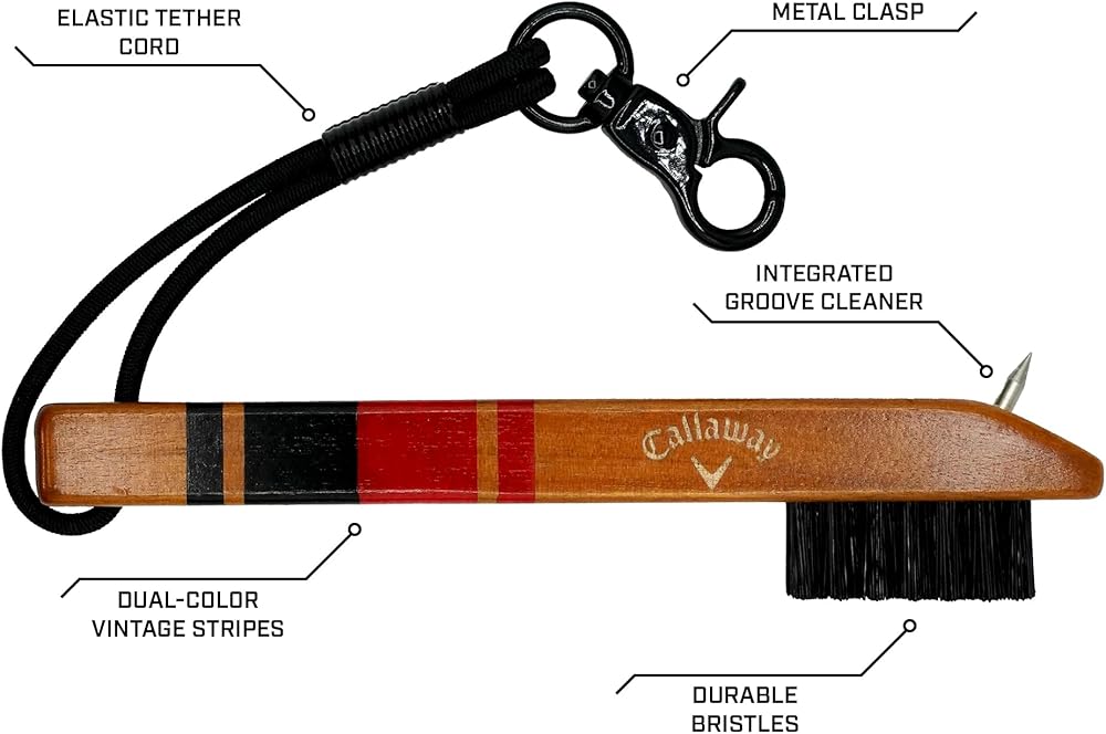 Take a trip down memory lane and add a touch of vintage charm to your golf game with our Callaway Golf Heritage Club Brush. The premium wooden handle and timeless design pay tribute to the rich history of golf, while also bringing convenience and functionality to the forefront. Effortlessly keep your clubs clean and performing at their best with the durable nylon bristles on our club brush. These bristles are tough enough to remove any lingering dirt, grass, or debris without causing damage to your beloved golf clubs. Say goodbye to struggling to clean your clubs and hello to a top-performing set every time you hit the course. But functionality isn't the only advantage of this club brush - it's also designed for style and comfort. The ergonomically shaped handle fits perfectly in your hand, making it easy and comfortable to clean your clubs between swings. No more sore hands from rough, uncomfortable cleaning tools. And let's not forget about the small, yet crucial detail - the integrated metal groove cleaner. This feature ensures that your club grooves are kept free from debris, ensuring optimal performance during your swing. After all, it's the small details that can make a big difference in your game. Worried about losing or misplacing your club brush? No need to stress, as our brush comes equipped with a convenient clip attachment. Simply secure it onto your golf bag and you'll never have to worry about searching for it again. So why settle for a basic, average club brush when you can have one that not only keeps your clubs clean and performing at their best, but also adds a touch of nostalgia and style to your game. Upgrade your golf bag with the Callaway Golf Heritage Club Brush today.