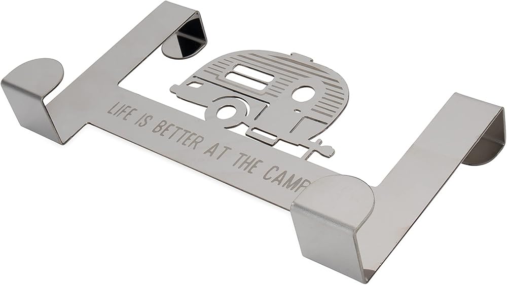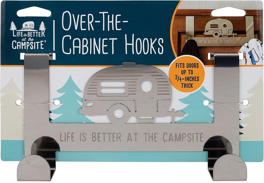 Camco's Life is Better at the Campsite Over the Door Towel Hanger provides (4) hooks for hanging towels, bathrobes, jackets, hats, scarves, purses and more. It is a perfect solution for small places—ideal for bedrooms, bathrooms and closets. The hanger fits standard interior doors up to 1 ½-inches thick. Easy to use, it simply hangs over your door—no tools required. Features a retro RV design with the phrase, "Life is Better at the Campsite". Measures 12-inches (L) x 5 ½-inches (W) x 3-inches (D) and is constructed of durable stainless steel.