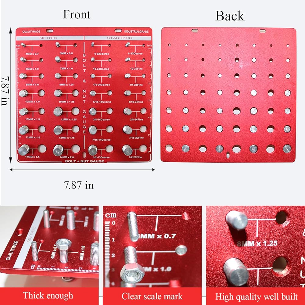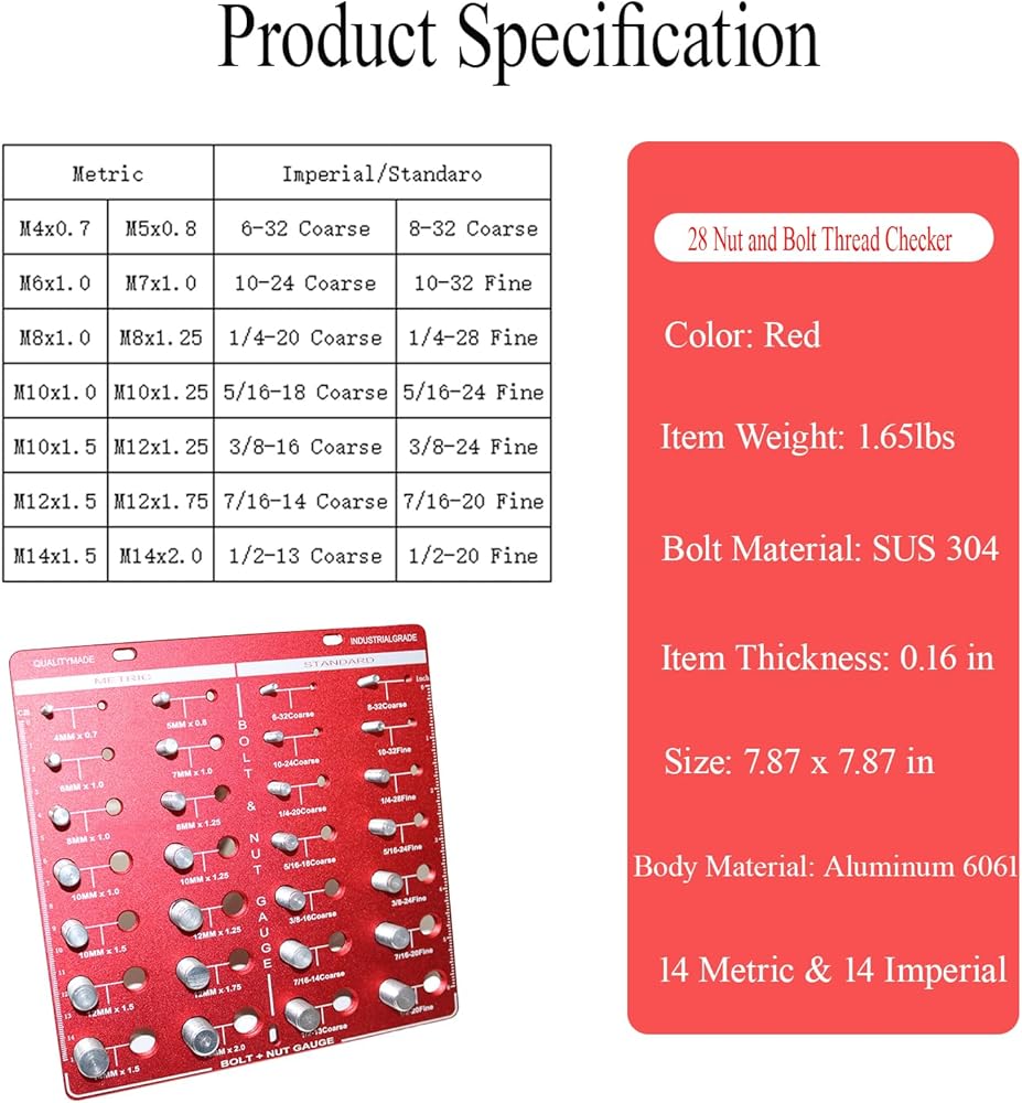 28 Nut and Bolt Thread Sizes: Our thread checker has 14 Standard size +14 Metric size; It covers the metric thread sizes from M4*0.7 to M14*2.0, and the standard threads from # 6-32 fine to 1/2-20 fine