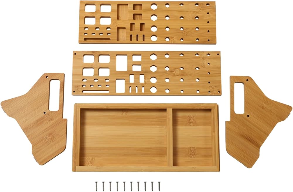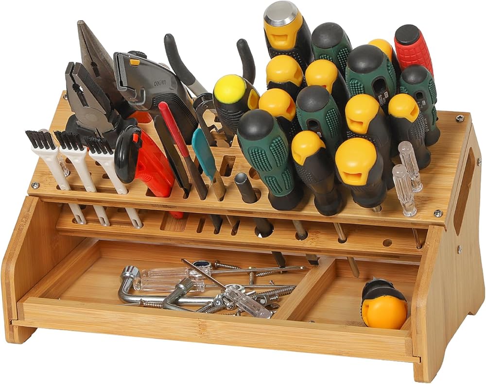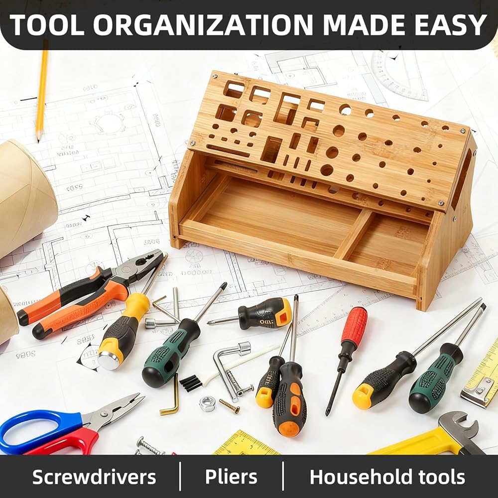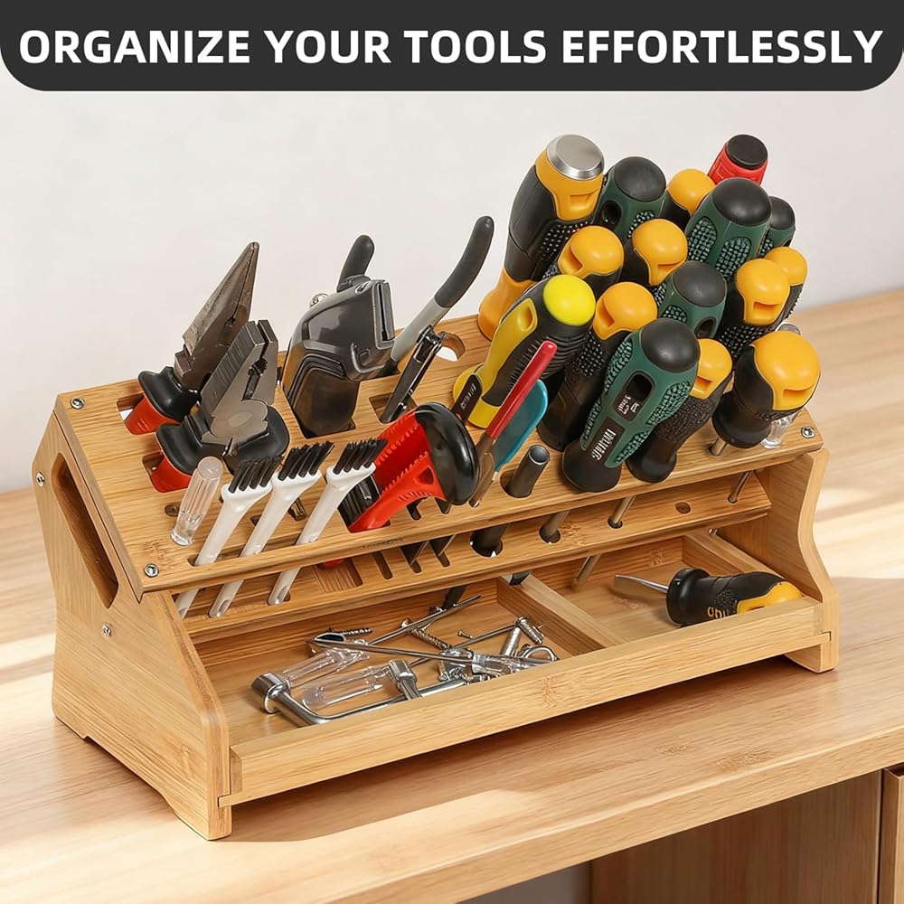 BUILT TO LAST & SPACE-SAVING: Constructed from long-lasting bamboo, this hand tool organizer is both sturdy and space-efficient. It's designed to withstand daily use, ensuring longevity and reliability. This organizer is an ideal choice for professionals and DIY enthusiasts alike, offering a practical way to keep tools organized and accessible. Transform your cluttered workspace into a tidy, efficient area where every tool has its place.