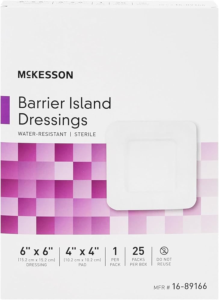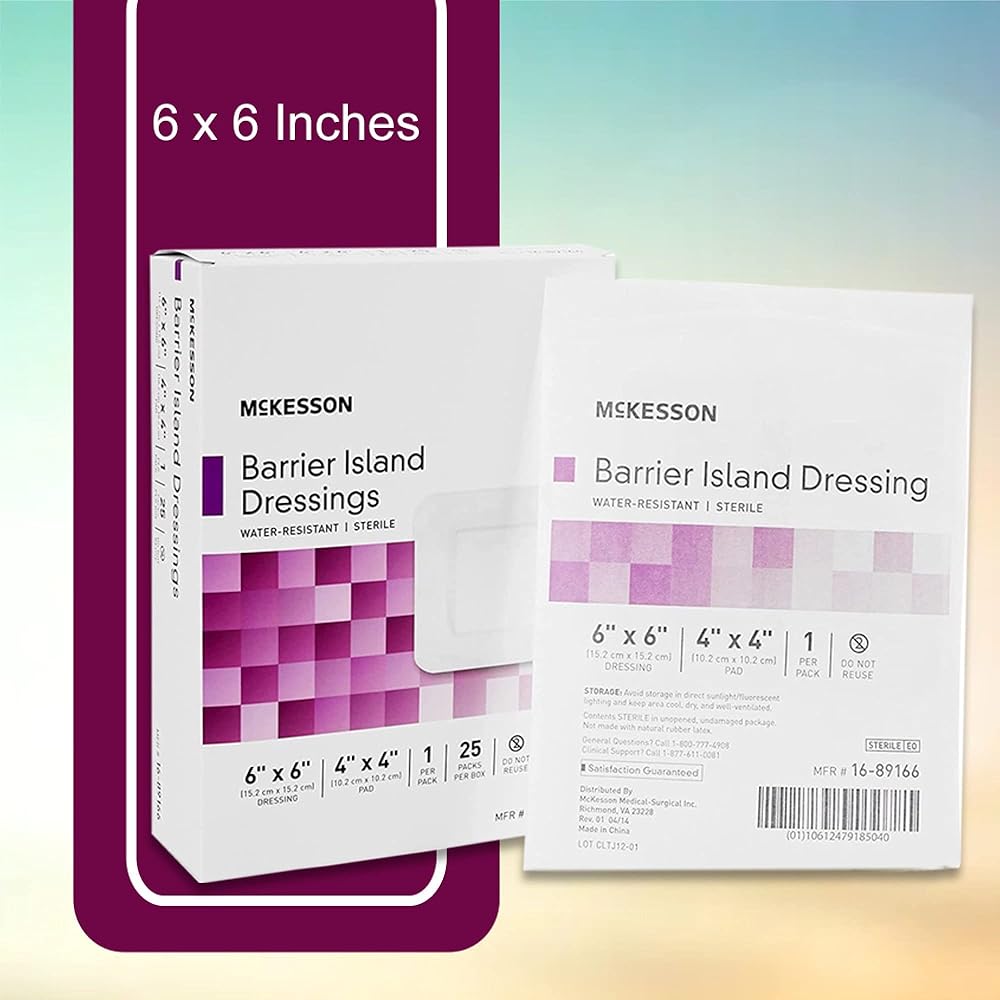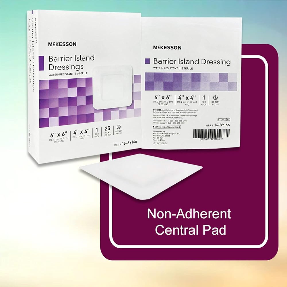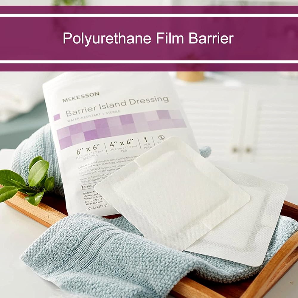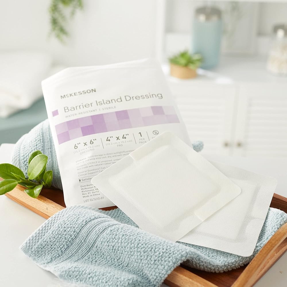 Square shaped 6 x 6 inch dressing with a 4 x 4 inch gauze pad is convenient for an all-in-one purpose; non-adherent pad surrounded by adhesive borders