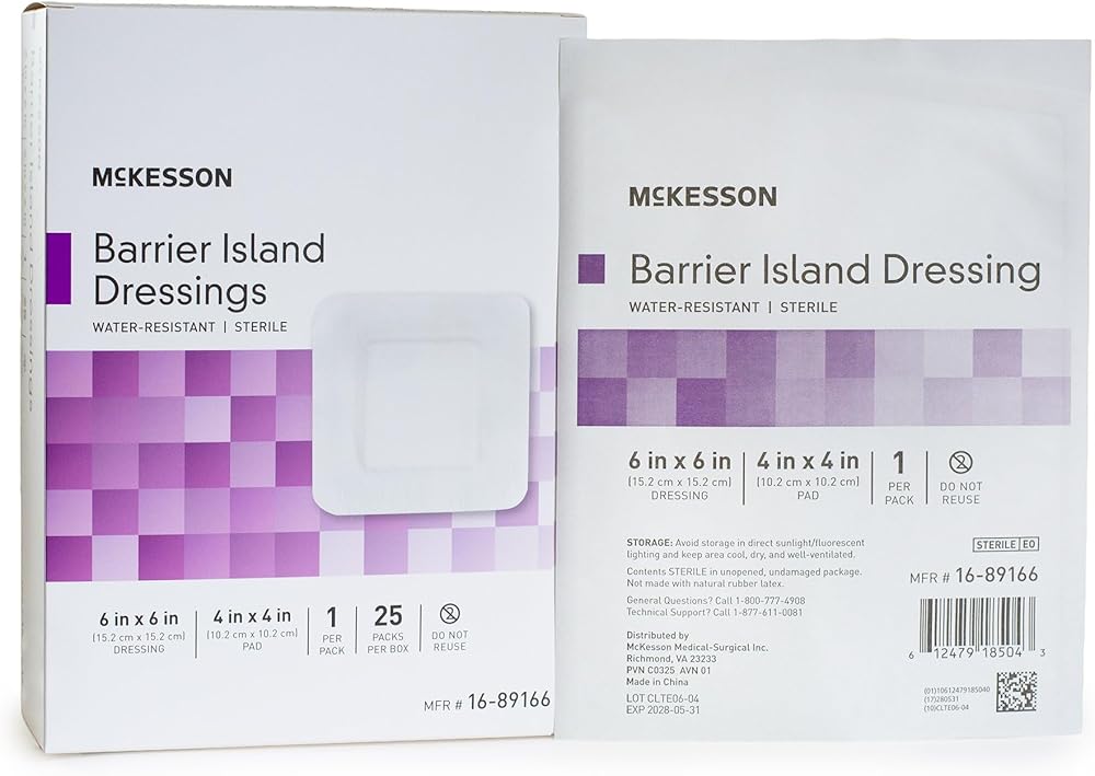 Barrier island dressing made up of polypropylene and rayon is secured with a polyurethane film that helps avoid ingress of bacteria and water
