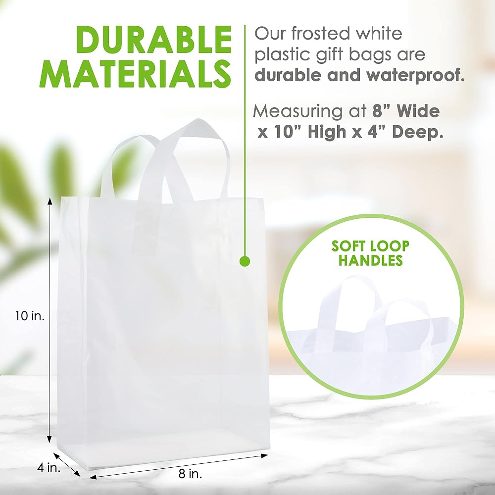 TRANSPARENT MATERIAL: Our frosted clear plastic gift bags with soft strap handles are made with durable, premium frosted plastic, but still give your items security and privacy. They come in handy for gifting, giving party favors and are great goodies and carry out bags. These bags are good for non-fragile items.