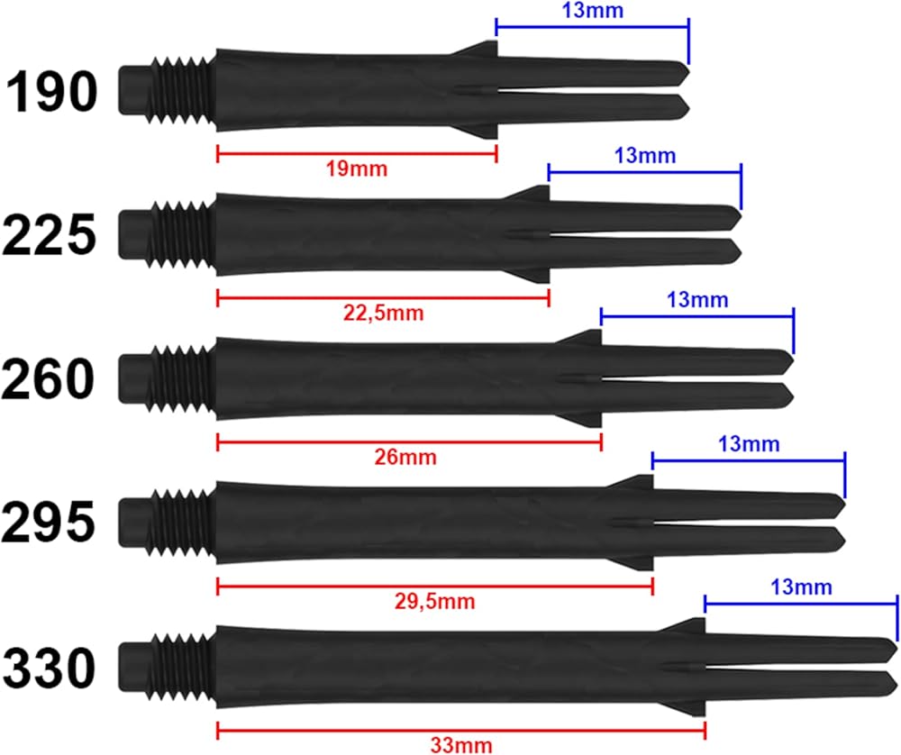 UNIVERSAL: These shafts can be used with paper flights, foldable flights, molded flights and all L-style flights. They also come in 9 different lengths, so you are sure to find the perfect size for your throw.