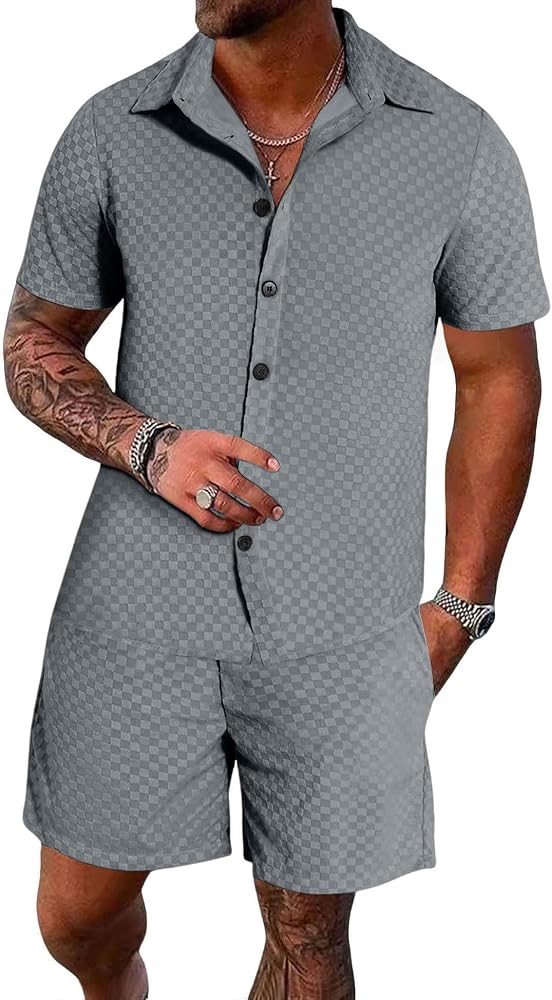 Design: Mens beach vacation outfit, checkerboard pattern, velvet fabrics, short sleeve, button front, adjustable drawstring, casual shorts, side pockets. This 2 piece set for men is a must-have for your wardrobe.