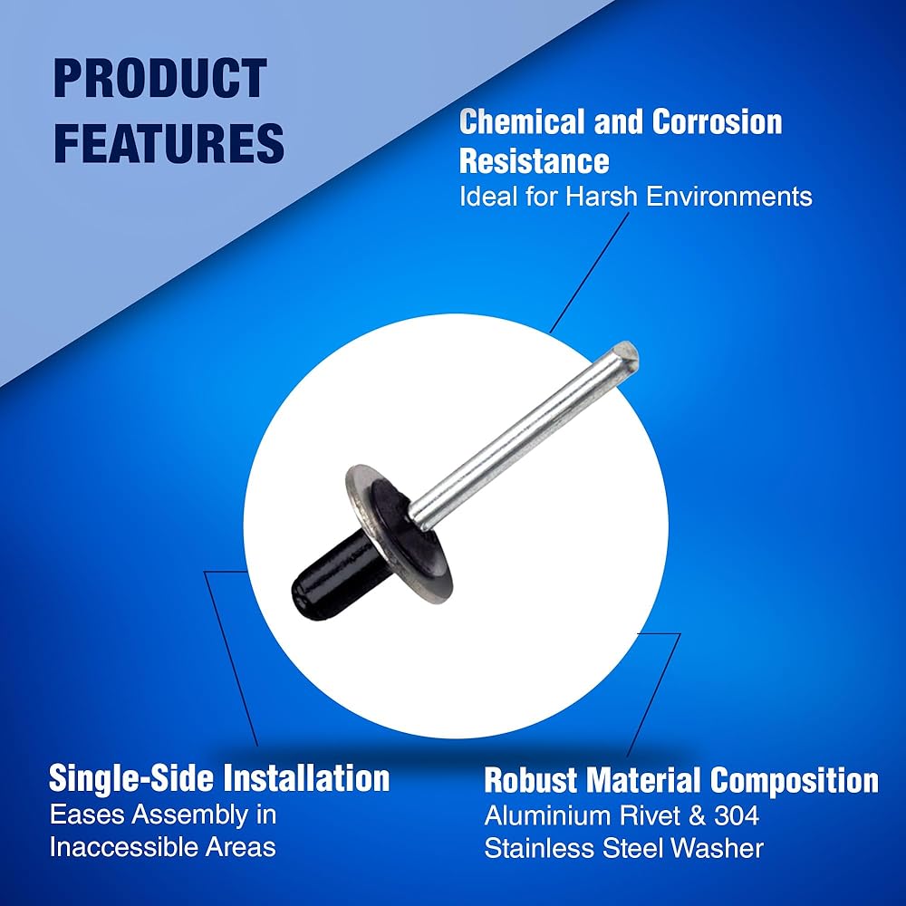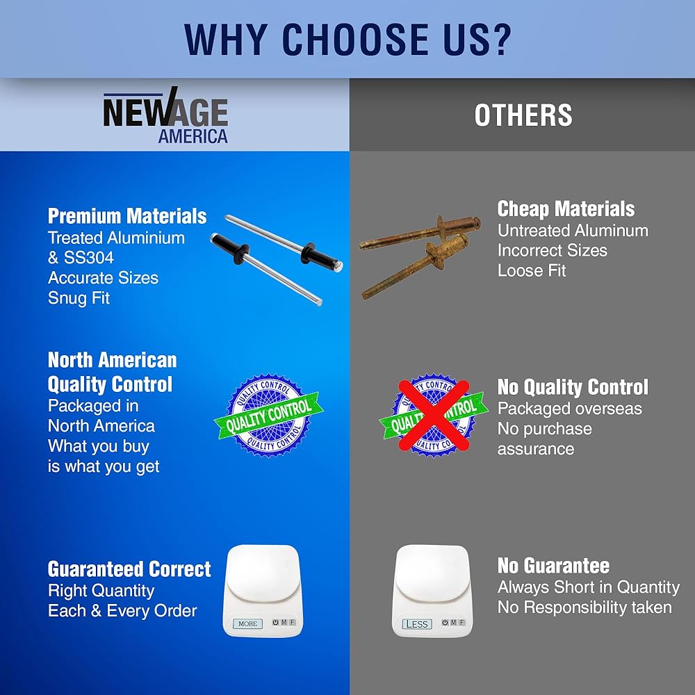 [Lifetime Warranty] Every Blind/Pop Rivet from New Age America, complete with Back Up Washers, is backed by our Exceptional Lifetime Warranty. These Rivets are Crafted from High-Quality Aluminum and 304 Stainless Steel, making them Abrasion-Resistant and Ideal for Preventing Corrosion, Scratches, and Other Wear. Designed to Withstand Rigorous Conditions, Our Pop Rivets and Blind Rivets Provide a Dependable Solution for a Variety of Construction and Manufacturing Needs