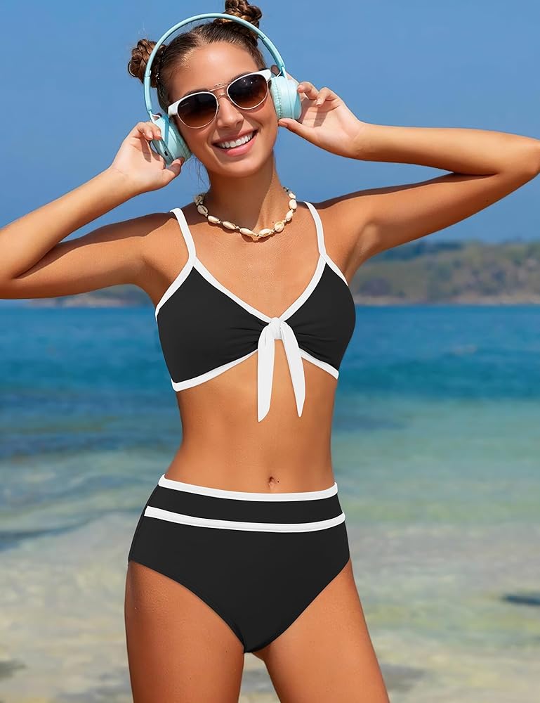 Design: The top of black two piece swimsuit is dual-use. When you knot the strap in the front, it's a V-neck bikini; when you remove that strap, it becomes a tankini. You can also easily take away the built-in bra pads. High waisted bikini panties and swimsuit cover up combination is full of stylish flavor