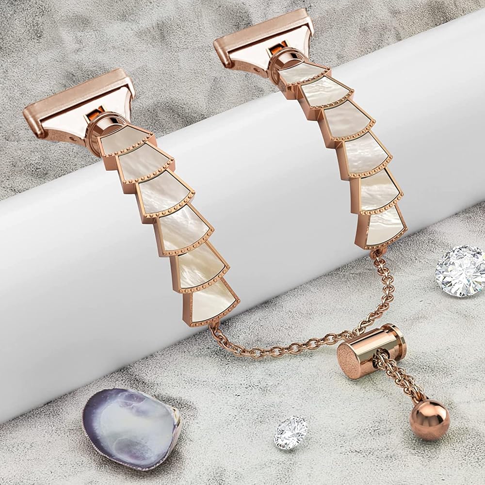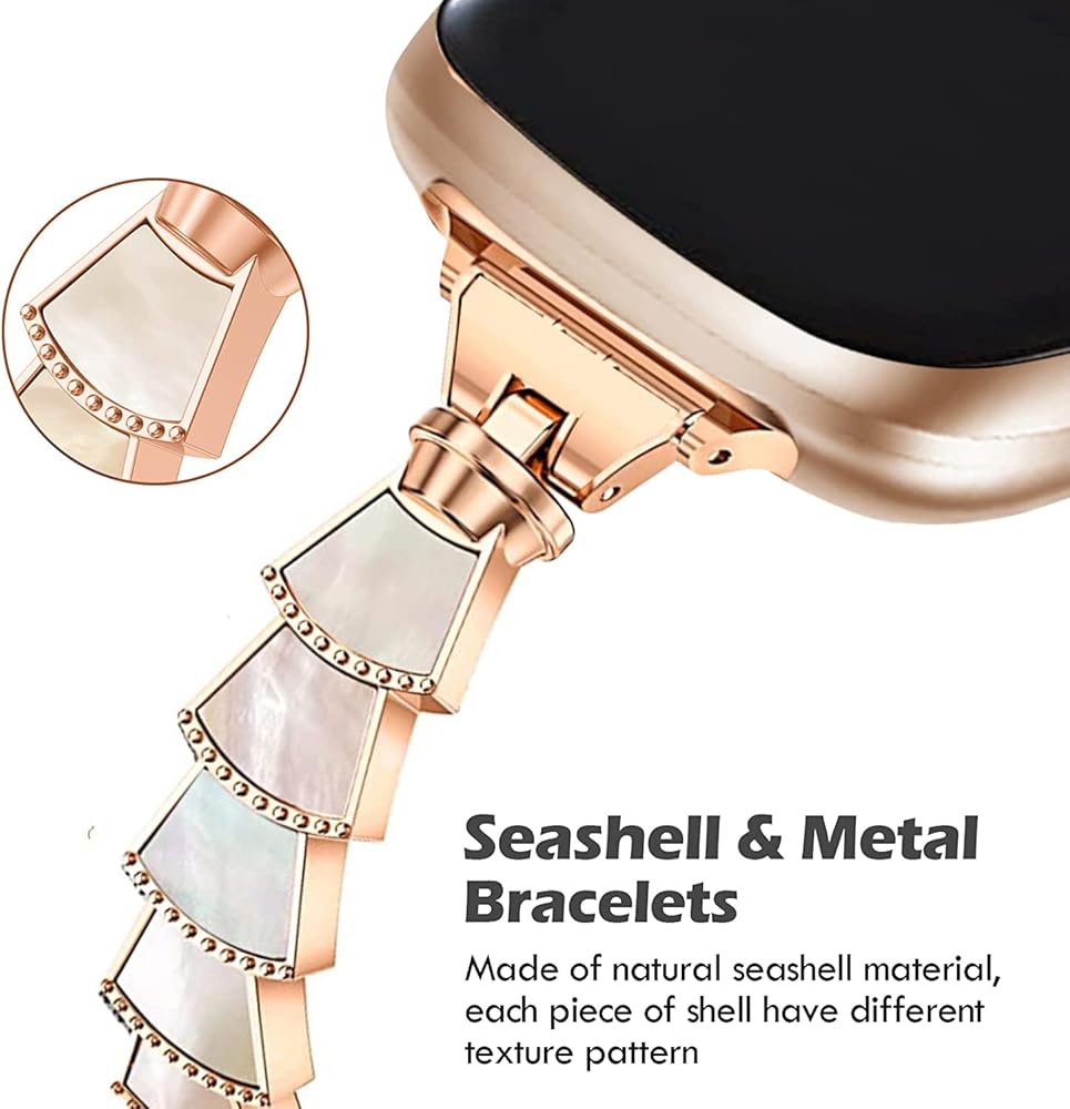 Elegant Design: The two arc-shaped metal blocks of the watch band are designed to fit the wrist, with a size of 5.1*1.2cm (2*0.47 inches). The watchband is inlaid with beautiful pure color shells, which are made of advanced technology and are not easy to fall off. Make the monotonous metal strap more young and fashionable. With a classic copper chain to make your Apple Watch more elegant, you can tighten or loosen it with the chain to make it fit your wrist perfectly.