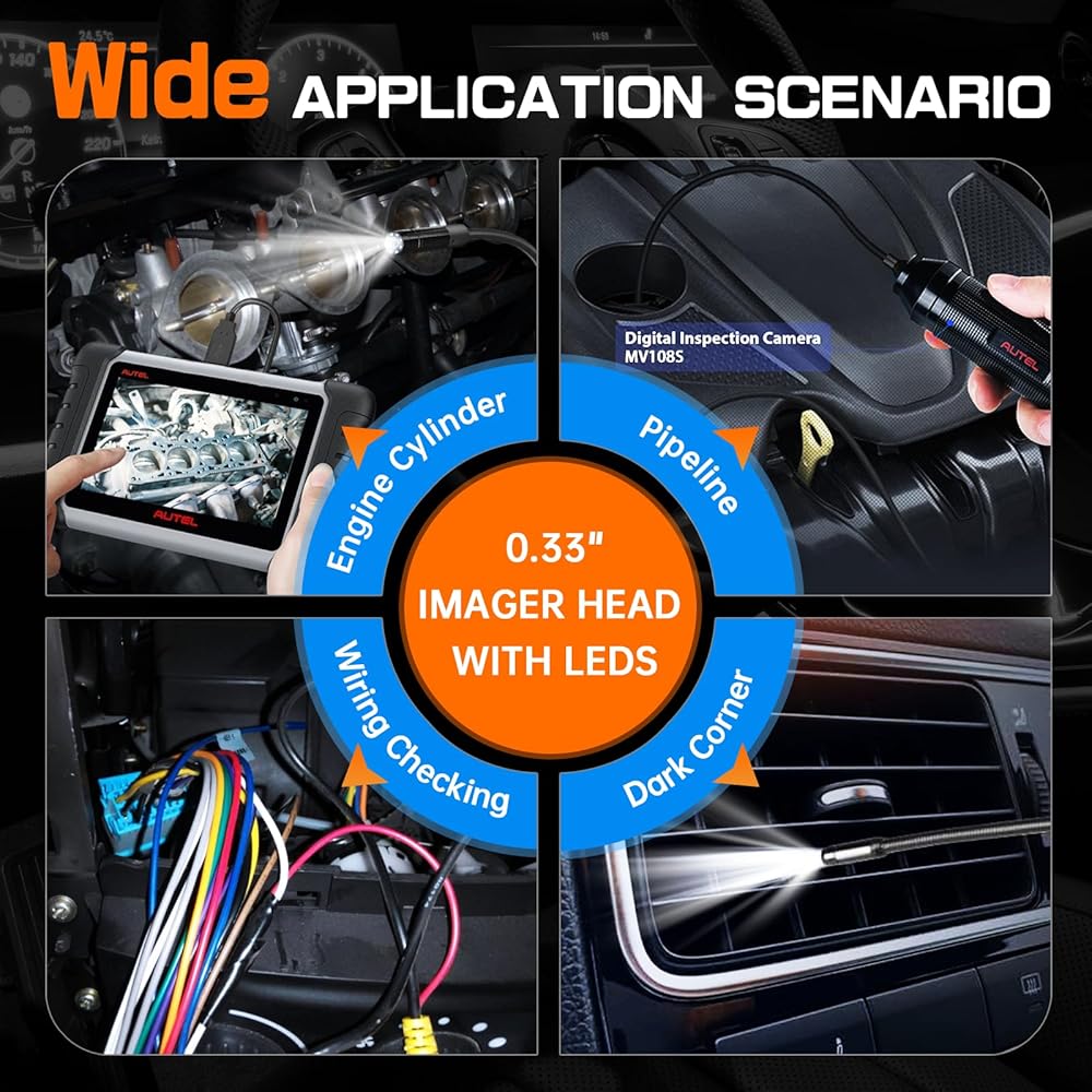 ✅【Wide Applications】Autel MaxiVideo Inspection Endoscope MV108S wonderful for up-close visual inspections in engine cylinders, most spark plug holes, and many other small part inspections in confined areas.Used in conjunction with MK808, it can be quickly positioned without disassembly, it is very convenient.
