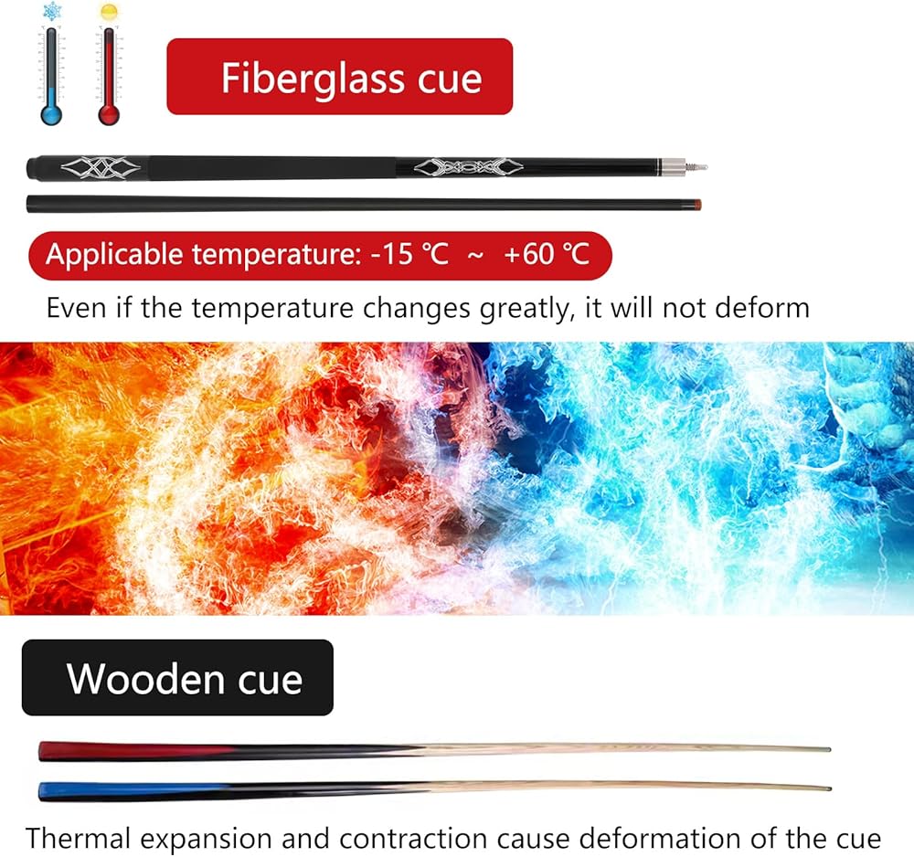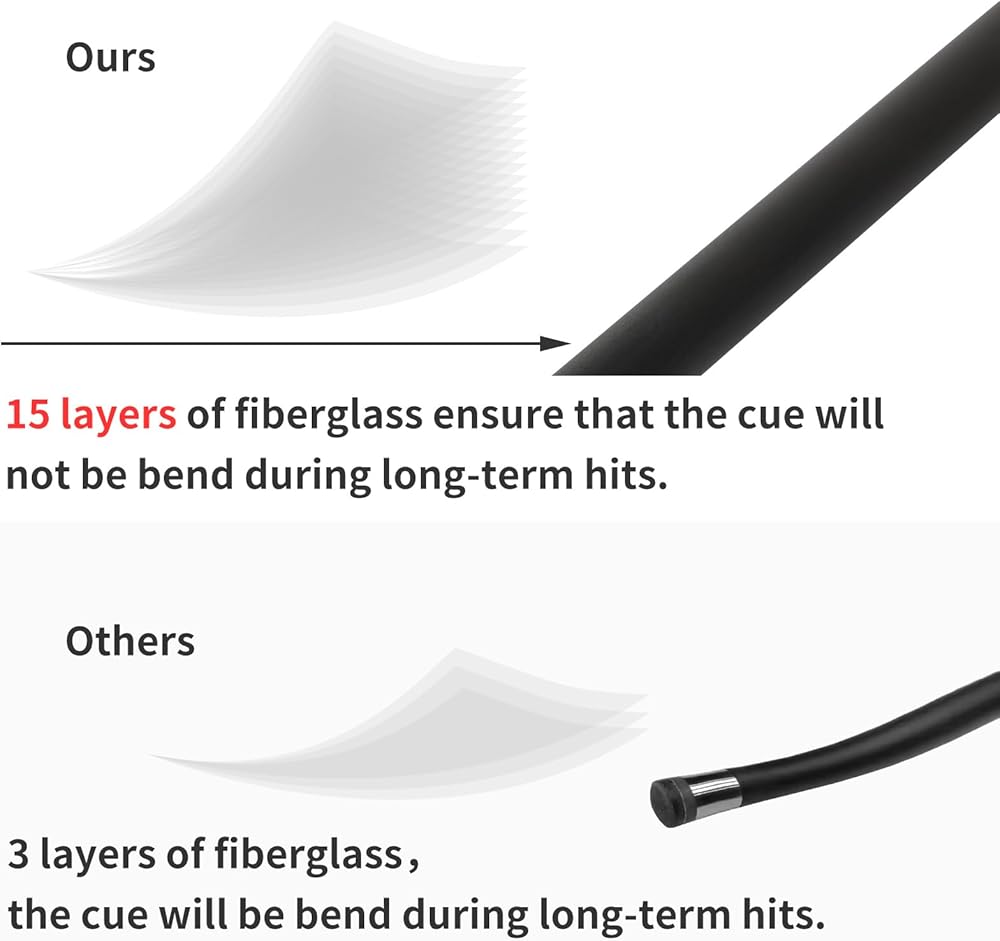 Material: The pool cue is crafted with 15 layers of high-strength fiberglass composite material, combined with cutting-edge technology; This cue stick offers exceptional resistance to deflection and durability against daily wear and tear