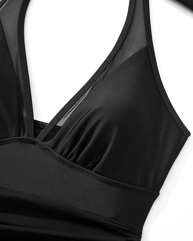 Halter Swimsuit:Halter bathing suit top,mesh sheer sarong and drawstring details at the hem adds a touch of active femininity,making you stand out in a crowd.