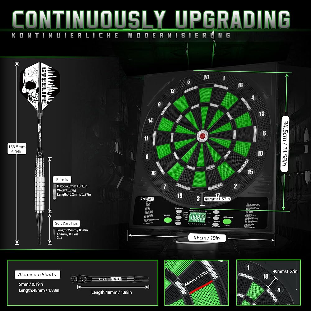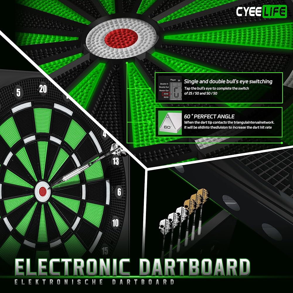 Professional Electronic Dartboard: Our electronic dartboard offers 34 games and 355 options(including 301, cricket, round the clock, high score),Support up to 8 players,You also have the option to play against the computer with 5 different difficulty levels: beginner, intermediate, advanced, experts and professionals. After the game, press the "PLAYER" button to see the average score of each player's thrown darts and see how well each player can throw.
